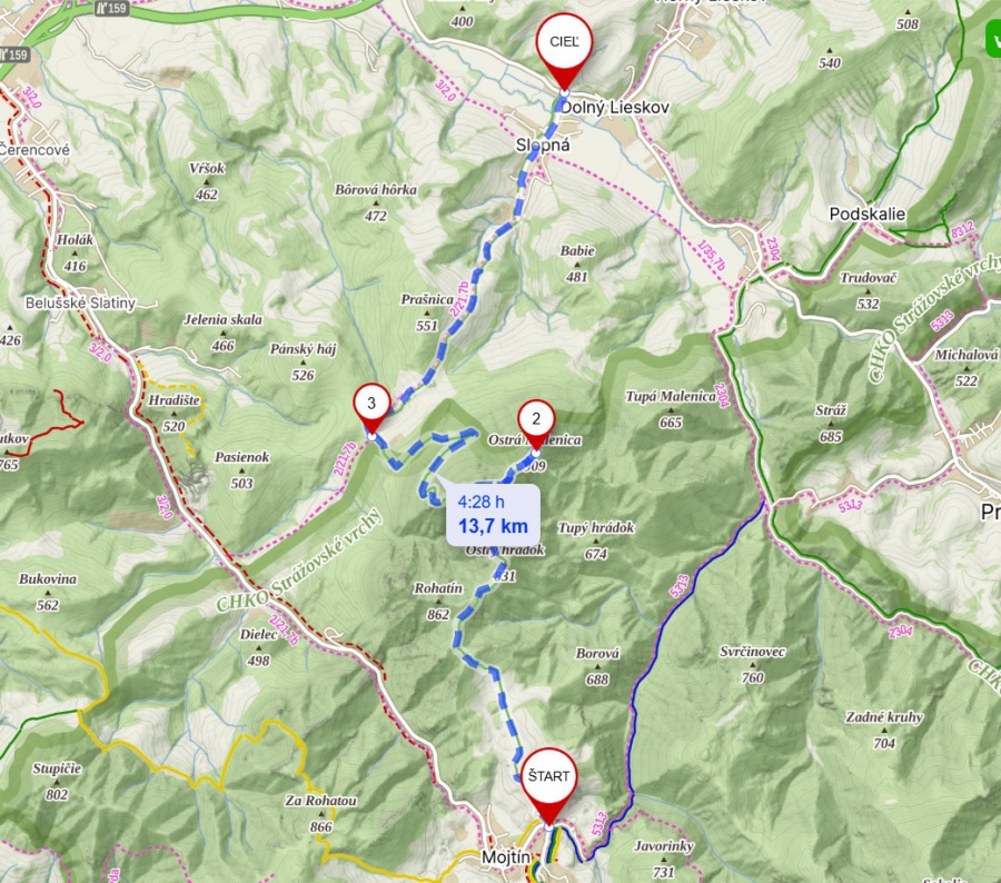 Mojtín, Gombár - Malenica - Ostrá Malenica - Malenica - Podmalenica - Slopná, rázcestie