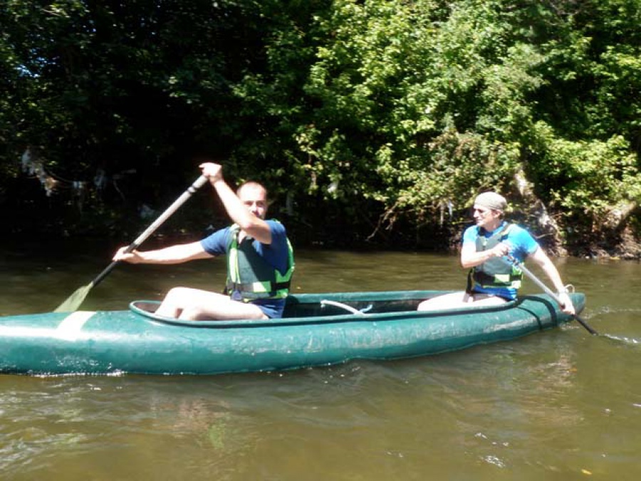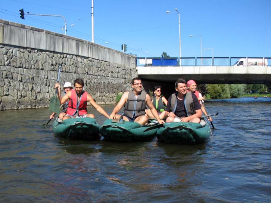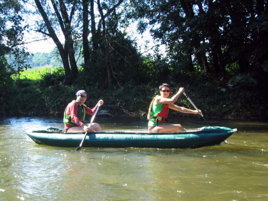 V sobotu ráno sme vyrážali od motorestu, a tak sme sa pomerne rýchlo dostali na vodu. Deti a nováčikov sme naložili do raftu, skúsenejší si zobrali dvojmiestne kanoe. Na august pomerne dobrá a rýchla voda, na Hron až nezvyčajne priezračná, nezakalená letnými búrkami, sľubovala celkom slušný vodácky zážitok. Celkový dojem kazilo iba množstvo odpadkov zachytených pri brehoch, pochádzajúcich z horehronských osád.