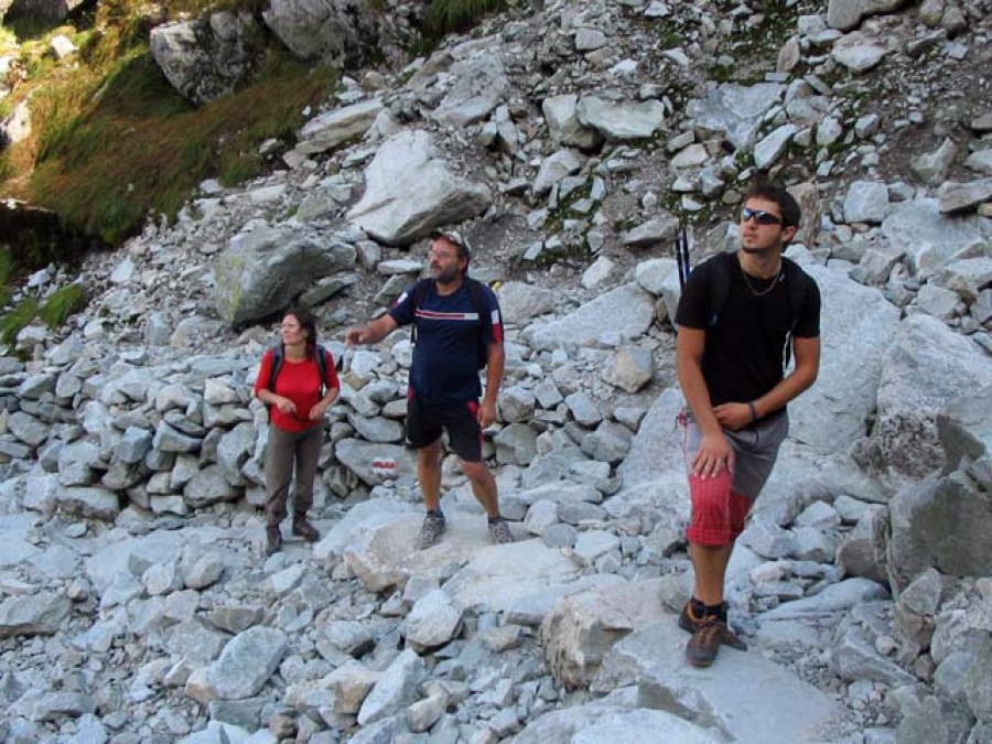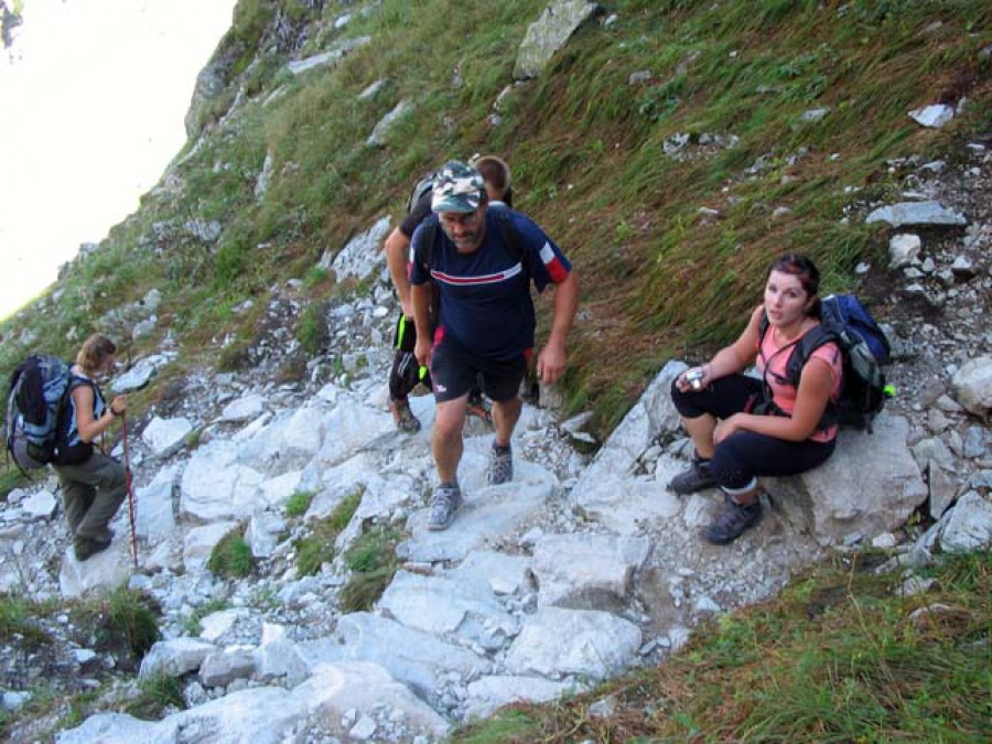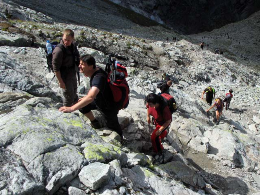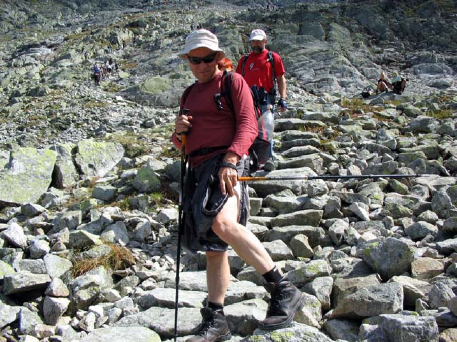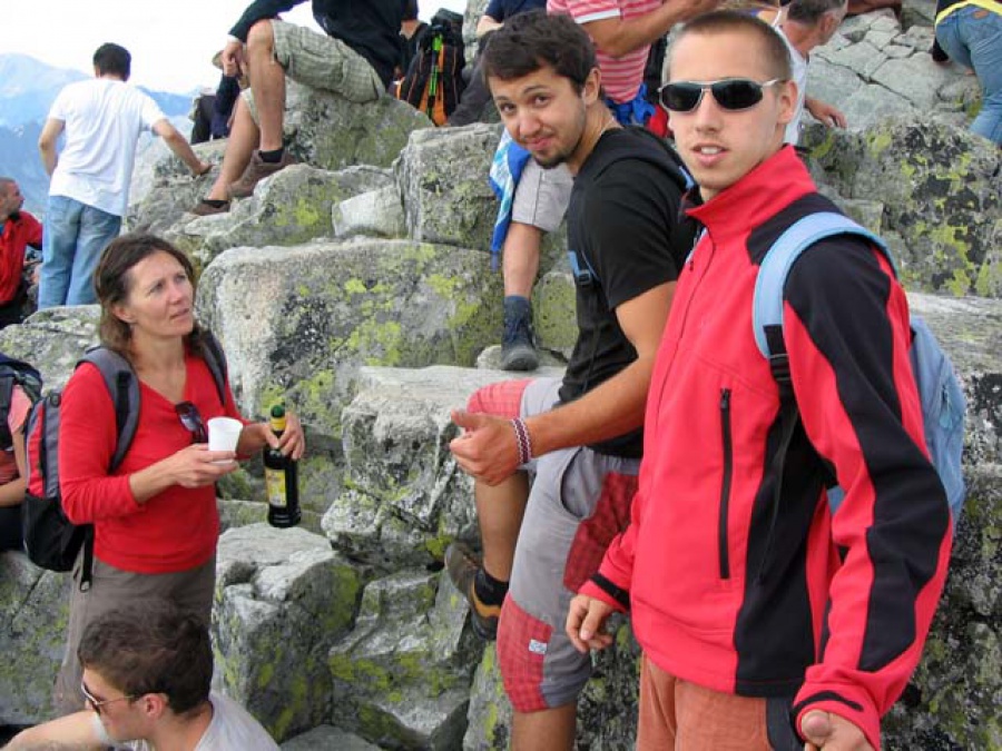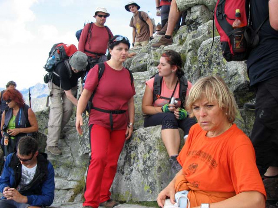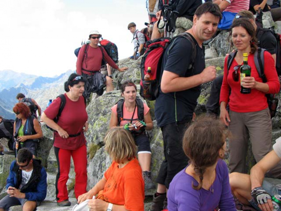 Autobus 13 členov posádky vysadil na hraniciach v Lysej Poľane, odkiaľ sme sa vydali pešibusom na asi dvojhodinovú asfaltovú púť k Morskiemu oku (plesu) a potom po kamenných schodoch idúcich strmo hore k ďalšiemu krásnemu tyrkysovému plesu, Czarny staw pod Rysmi. Na tejto trase premávajú aj konské vozy, no my ako správni turisti, sme túto možnosť nevyužili... Alebo to bolo preto, že Dušan tvrdil, že koníky to už majú za pár a peši tam budeme skôr? Asi viete, ako to dopadlo - celú cestu nás obiehali kone v plnej sile a rýchlosti. Pri Czernom stawe nás čakal smerovník s potešujúcim údajom: Rysy 3h 20min, tak sme sa len v rýchlosti napili, pokochali kačkami, ktoré je zakázané kŕmiť a vybrali sa ďalej. Krásne slnečné počasie, teplota tak akurát na poriadne spotenie sa a asi 397 Poliakov smerujúcich tam, kde my. Asi mali nejaký sviatok alebo národný výstup na svoj najvyšší vrch, lebo ich tam bolo naozaj veľa a ešte viac. Výstup na Rysy z tejto strany je podľa mňa náročnejší ako z našej. Od Czarneho stawu sa ide tie 3 hodiny stále prudko hore a na záver nás čakali moje obľúbené retiazky. Zapotili a zadýchali sme sa poriadne. V dôsledku veľkého počtu turistov, z ktorých mali niektorí obuté naozaj zaujímavé veci (čo nepochopím asi nikdy), sa tvorili na retiazkach zápchy ako v PB na hlavnej križovatke pred výstavbou diaľnice. Zobrali sme to krížom krážom okolo retiazok, pretože nás tlačil čas odchodu autobusu od Štrbského plesa. No v zápche tesne pod vrcholom sme trčať ostali, nedalo sa to obísť. Vrchol, šup šup sa pretlačiť k vrcholovej tabuľke Rysy 2.499 m.n.m., foto, kochanie sa nádhernými výhľadmi na všetky strany a zostupujeme na najvyššie položenú chatu v Tatrách, na Chatu pod Rysmi, ktorá je síce v rekonštrukcii, ale funguje, tak sme sa mohli najesť a osviežiť. Tu som sa dozvedela, že som mala česť byť na vrchole, ktorý navštívil napríklad V. I. Lenin alebo poľsko-francúzska vedkyňa Marie Curie-Sklodowska s manželom. Smerovník hovoril, že na Štrbské pleso je to 2h 45 minút, čo bolo len tak tak, aby nás tam nenechal autobus a tak sme museli chtiac - nechtiac vyraziť dole. Ak použije skratku jeden, je to buran, čo ničí prírodu...ak ju použije väčšina, je to oficiálny chodník, a tak sme si aj my sem tam skrátili prudké klesanie, aby sme pošetrili naše kĺby. Míňame Žabie plesá, Popradské pleso. Od Popradského plesa to k Štrbskému bolo nekonečné, vždy, keď sa stáčal chodník sme dúfali, že sme už tam. Nakoniec sme to stihli v predstihu, a tak sme si čakanie na autobus spríjemnili dojedením a dopitím toho, čo sme nezužitkovali už skôr. Štyria účastníci tohto zájazdu zdolali v jednom týždni najvyššie vrcholy dvoch štátov - Poľska a Rakúska - čo si zaslúži uznanie. Hlavne, keď sa mi zdalo, že sme cestou hore viac fuňali na tomto ako na vyššom rakúskom kopci.
