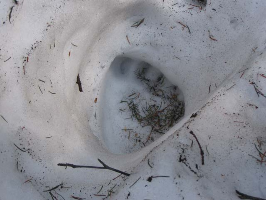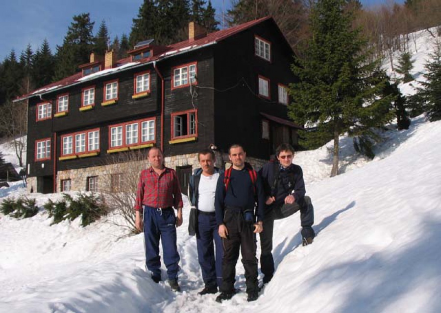 Na cestu sme sa vybrali v piatok doobeda za krásneho slnečného počasia. Zaparkovali sme v Strečne a cez lávku ponad Váh sme sa vybrali navštíviť našu kamarátku na chate pod Suchým vrchom. Po červenej turistickej značke sme popri Váhu vykročili do Starohradskej doliny. Pod Starým strečniaským hradom na rázcestí červenej a modrej značky sme sa rozhodovali ako ďalej. Nevediac čo nás čaká vybrali sme si to horšie – modrú (serpentínovú) trasu. Na to sme však prišli až po niekoľkých stovkách metroch. Trasa viedla severným traverzom hrebeňa. Snehu pribúdalo, začalo sa brodenie a záveje. Najhoršie bolo, že chodník sa stratil a išlo sa len po značkách, ktorých na serpentínach býva málo - veď v lete vidno chodník a nie je kam odbočiť. Po 2,5 hodinách sme sa dostali na chatu. Za odmenu nás tu vítala nádherná modrá obloha zaliata slnkom a sympatická ženská obsluha. Na to, že bol Veľký piatok, bolo na chate hodne nadšencov prírody. Po občerstvení sme sa pobrali naspäť po červenej značke. Kúsok od chaty chodník križovali podivné stopy (že by medveď? – viď obrázok. Po pol hodine sme vyšli na hrebeň a bolo po snehu. Nasledovala pekná cesta na Starý hrad a po nej až do Strečna. Na Liptov sme prišli už za tmy.