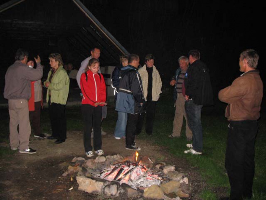 V sobotu sme sa vybrali na návštevu Bojníc. Vedeli sme, že na zámku je festival duchov a strašidiel, ale nepočítali sme s takým veľkým záujmom. Na vstup do zámku sme čakali viac ako 2 hodiny (strašné). Prehliadka bola orientovaná skôr na herecké predstavenie v jednotlivých priestoroch zámku. Na prehliadku exponátov nebol čas – možno nabudúce. Pretože čas pokročil ďalší program sme upravili a urýchlili. Prezreli sme si ľudovú architektúru dreveníc v Čičmanoch a neobišli sme ani slovenský betlehem v Rajeckej Lesnej. Po doplnení nevyhnutných zásob a nákupe suvenírov v obchodnom dome Tesco sme pomohli pri stavaní mája, spojenom s kultúrnym programom v areáli základnej školy v Považskej Teplej. Spoločenský program pokračoval podávaním gulášu. Napriek našim počiatočným obavám si viacerí naši priatelia porcie zopakovali. Po večeri sa vytvorili skupiny diskutujúcich, ktorí si až praskotom ohňa uvedomili, že je už tma. A tak nasledoval posledný chod – opečená slanina a klobáska.