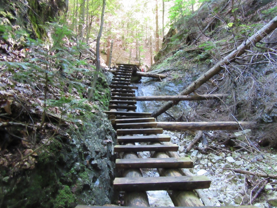 Prvý deň, ešte pred ubytovaním (privát v Hornom Smokovci), sme túru začali od autocampingu v Podlesku. Po zelenej značke popri potoku Veľkej Bielej vody a lesným chodníkom sme sa dostali do osady Píla. Na rázcestí sme odbočili doľava na žltou značený chodník, ktorý nás doviedol do tiesňavy Stredné Piecky. Zo začiatku to bola prijemná prechádzka pozdĺž potoka s častým prechádzaním z jednej strany brehu na druhý za pomoci popadaných stromov a kameňov poukladaných v koryte potoka. Asi dvadsať minút nám trvalo, keď sme prišli k prvým mini vodopádom, na ktorých boli drevené rebríky. O chvíľu sme sa dostali k najväčšiemu vodopádu v Stredných Pieckach s najdlhším rebríkom v Slovenskom Raji. Nasledovalo ešte niekoľko kaskádových vodopádov (Kaskádový a Terasový) ponad ktoré sme išli drevenými rebríkmi a lávkami, na mnohých miestach s popadanými stromami. Drevené rebríky boli vlhké od padajúcej vody z vodopádov, preto sme si museli dávať pozor na pošmyknutie. Ešte niekoľko metrov sme išli riečiskom, neskôr sme stúpali strmo hore na zvážnicu a pokračovali po nenáročnej traverzujúcej lesnej ceste k rázcestiu Suchá Belá-vrch. Nenáročný zostup lesnou Glackou cestou nás doviedol k rázcestiu Pod Vtáčím hrbom, odkiaľ sme pokračovali na Kláštorisko, kde sme si spravili prestávku na obed. Zostupovú trasu sme si zvolili strmo dolu popri Kláštoriskovej rokline a cez Prielom Hornádu sme sa dostali k autu na parkovisku.