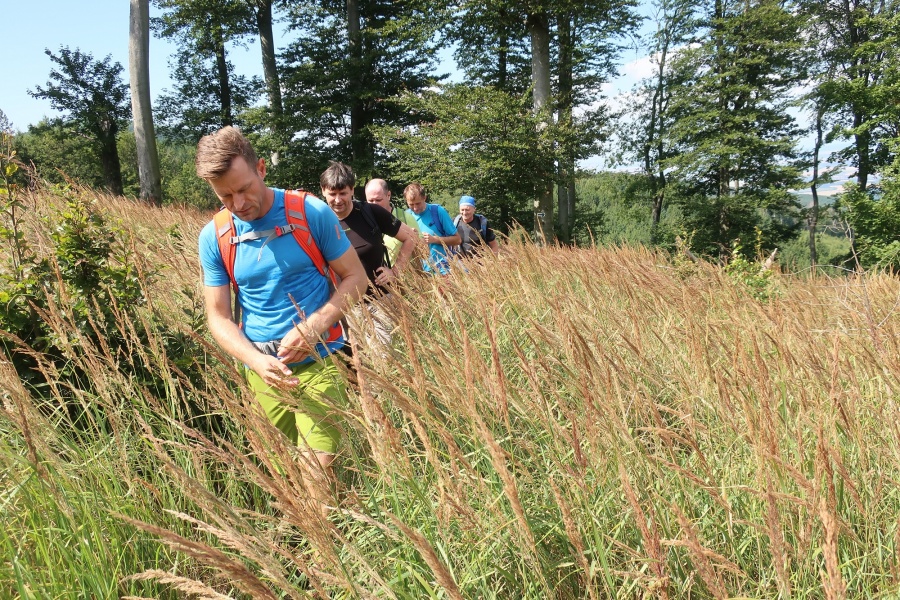 Na úvod nás čakala nekonečne dlhá asfaltová cesta, až neskôr sme odbočili na lesný chodník, ktorý viedol popri potoku. Počas výstupu sme stretali len cyklistov, lebo trasa sa viackrát križovala aj s cyklo chodníkom. Stúpanie na Medvedí vrch nám preverilo nie len fyzickú ale aj psychickú odolnosť. Značka nás zaviedla do terénu, kde celý úsek sme sa museli predierať vysokým malínčim, s množstvom chodníkov udupaných len od divej zveri.