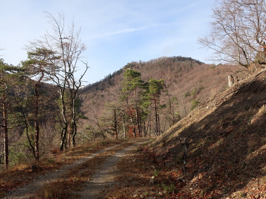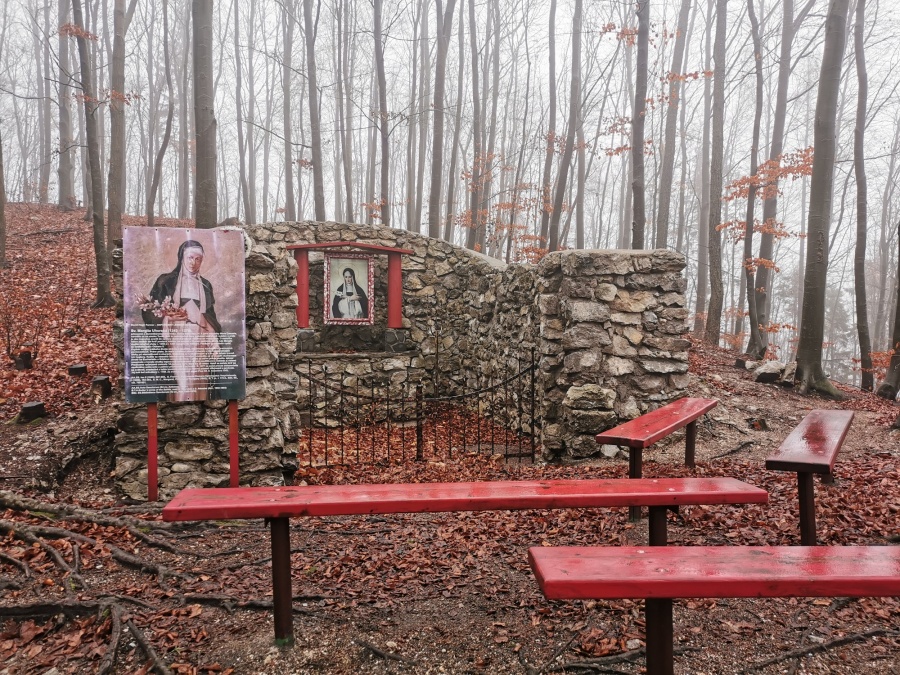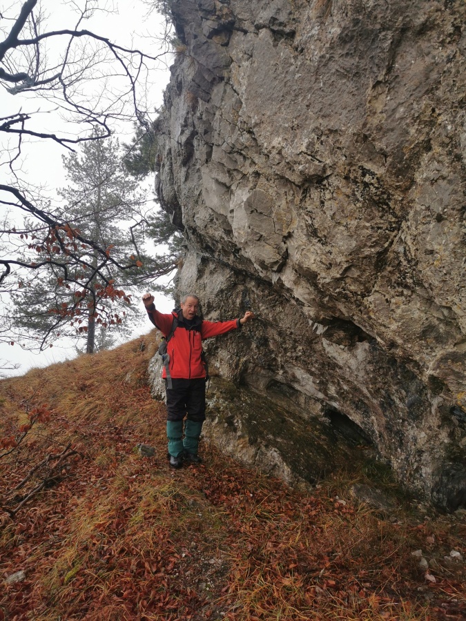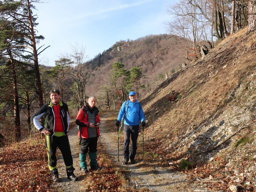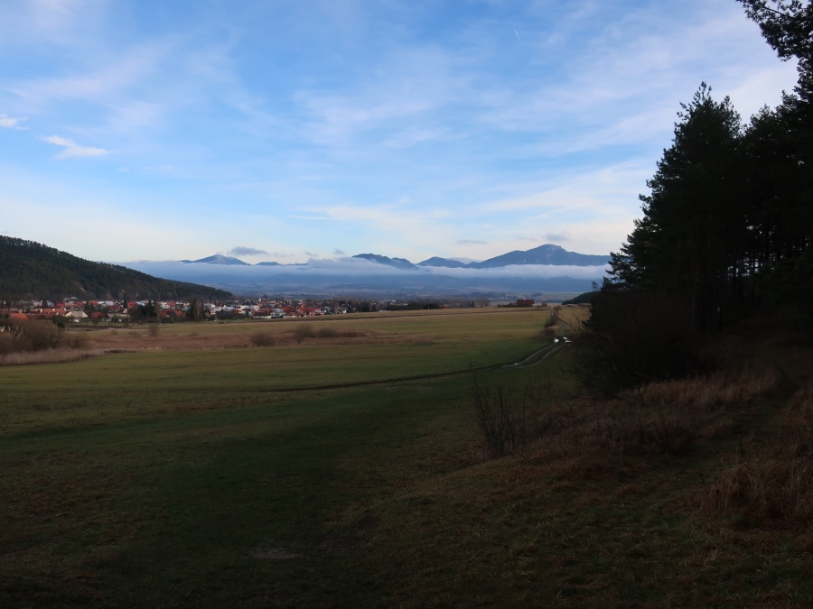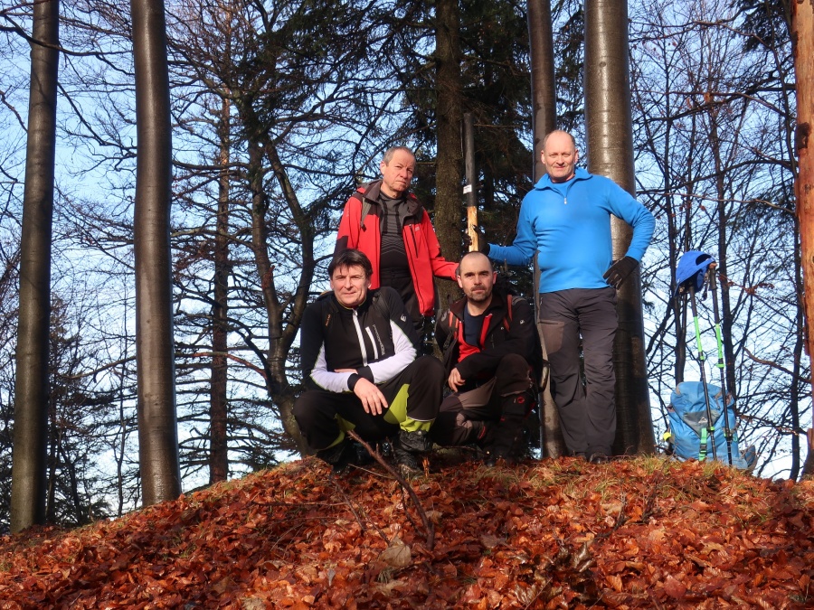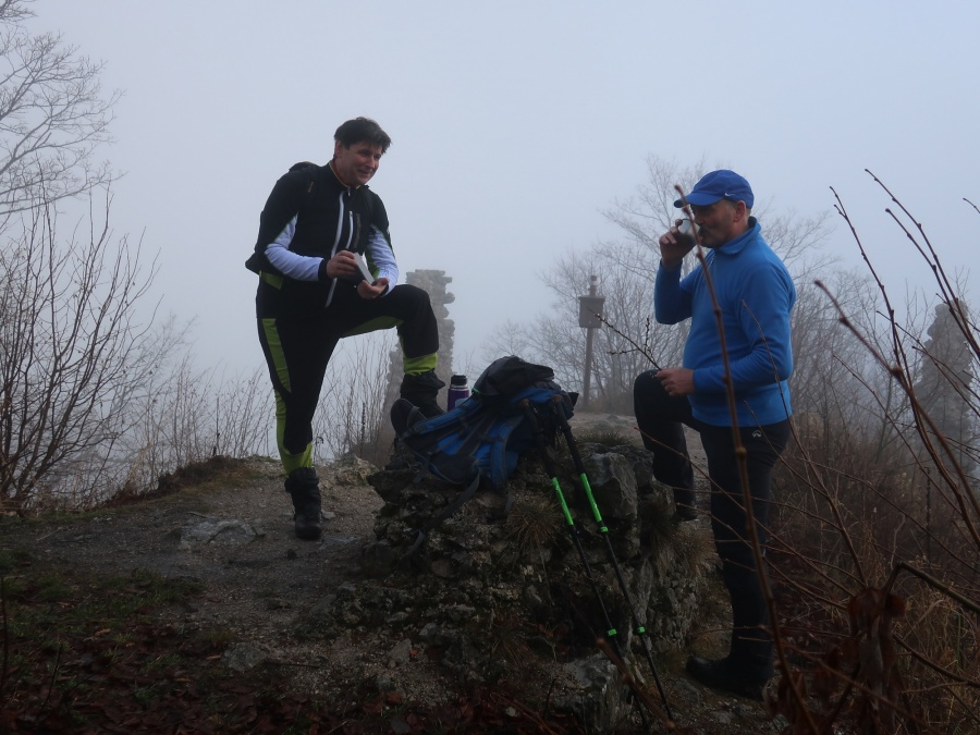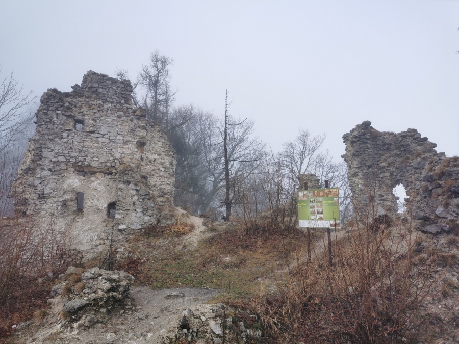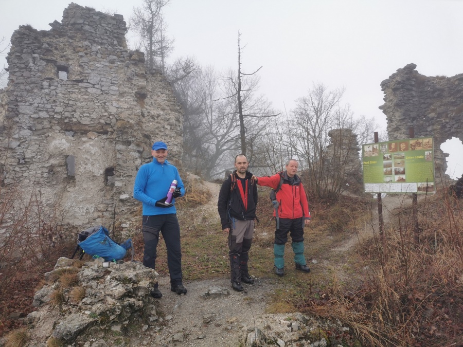 Ráno sme sa dohadovali, či má vôbec význam ísť, keďže ešte stále pršalo po celonočnom daždi a hustá hmla tiež nepridávala na optimizme, ale predsa sme to riskli. Zľava popri cintoríne (pri cintoríne sme zaparkovali auto) a krátkom úseku po lúke, sme po zelenej značke vyrazili na výstup. Minuli sme informačnú tabuľu Kalvárie SV.Kríža a vošli sme do lesa. Po prvom krátkom stúpaní, sme si mohli vychutnať pár minút prechádzky po vrstevnici cez borovicový les. Po prekrižovaní zvážnice, sme pokračovali pomerne strmo až ku zrúcanine hradu. Počas výstupu na hrad Zniev sme prechádzali okolo múrikom ohradeným oltára so svietnikmi, nad ktorým je obraz sv. Margity. Pred oltárom sú lavičky a vedľa je tabuľa ktorá návštevníkov informuje o živote sv. Margity. Odtiaľ strmo popri mohutnej skale, sme sa dostali až k širokej a pomerne hlbokej jaskyni (ideálne miesto na bivakovanie) s pokračovaním k zrúcanine hradu, ktorý svojou rozlohou patrí medzi tie menšie na Slovensku. Aj keď je tesne před Vianočnými sviatkami, na hrade sme našli práve rozkvitajúce sa bahniatka. Z hradu sme pokračovali záverečným stupáčikom na vrchol – je to malý ale nepríjemný suťový chodníček. Samotný vrchol bola len malá plošinka s turistickým smerovníkom uprostred. Z vrcholu Znieva sme zišli provizórnym dreveným rebríkom, ktorý bol opretý o skalu a pokračovali sme neznačeným chodníkom na najvyšší vrchol pohoria Žiar- Chlieviská. Sem- tam nám cestu ukazovali zvláštne značky, ale nedá sa na sto percentne spoľahnúť, že vedú priamo na vrchol. Nám sa to podarilo až na druhý pokus. Vrchol bol označený triangulačnou tyčou, pri ktorej sme si spravili vrcholové foto. Zostupovali sme rovnakou trasou po značkách až tesne pod vrchol Znievu, odtiaľ sme sa pustili dolu vyschnutým potokom a napojili sa na zvážnicu, ktorá nás doviedla na zelenou značený chodník smerujúci do dediny. Na spiatočnej ceste sme ešte odbočili na kalváriu, k pútnickému kostolu obkolesenému múrom s kaplnkami - zastaveniami krížovej cesty. Táto zachádzka nás zdržala cca 30 minút.