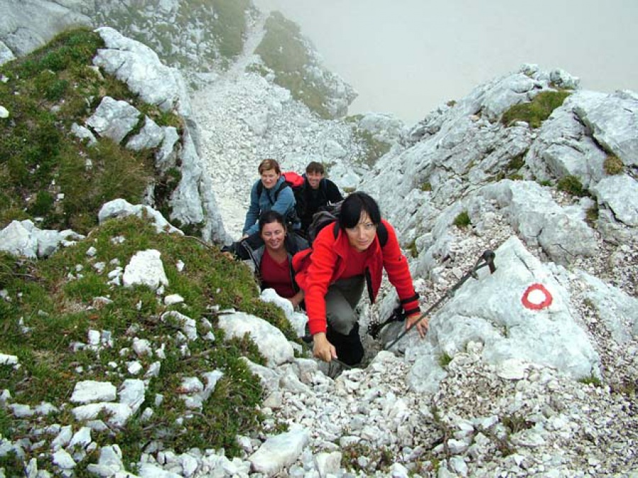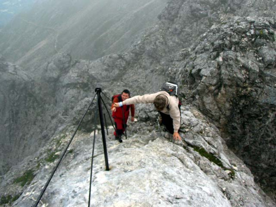 A už je tu ráno s budíčom o šiestej. Po miernych kozmetických úpravách sme sa vydali na "light" túru - Prisojnik (2 547 m.n.m.). Začiatok túry bol na parkovisku - Vršič (1 611 m.n.m.). Na vrchol sme chceli vyjsť cez Veľké Prisojnikove okno, ale počasie nám neprialo, prší, hmla a klzký terén nám nedovolí prejsť cez chodník. Vraciame sa a na vrchol ideme ľahšou trasou. Záver výstupu je exponovaná - Via Ferrata, ale trasa sa dá prejsť bez väčších problémov. Cestu späť sme si vybrali cez Zadný Prisojnik a Škrbinu. Cesta bola nekonečne dlhá, spestrená Via Ferratami. Večer zapíjame smútok, že sme nesplnili cieľ, prejsť cez Prisojnikove okno.