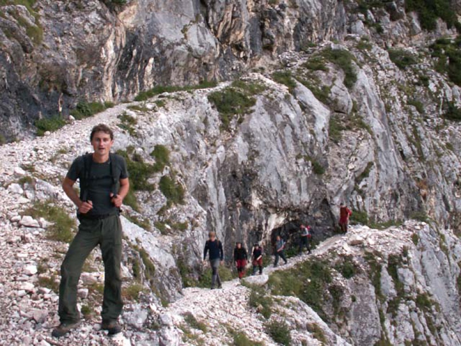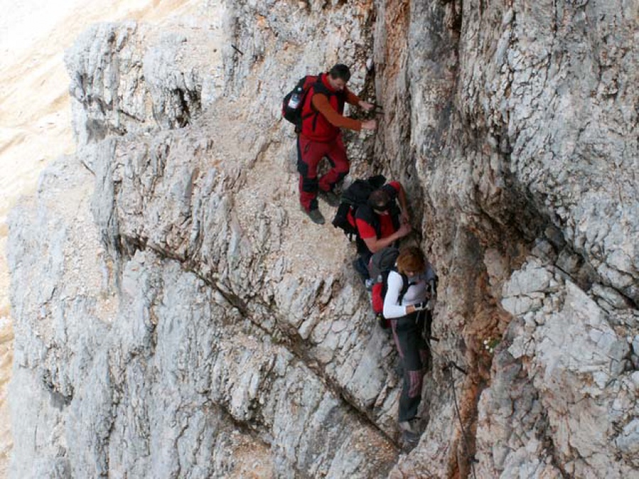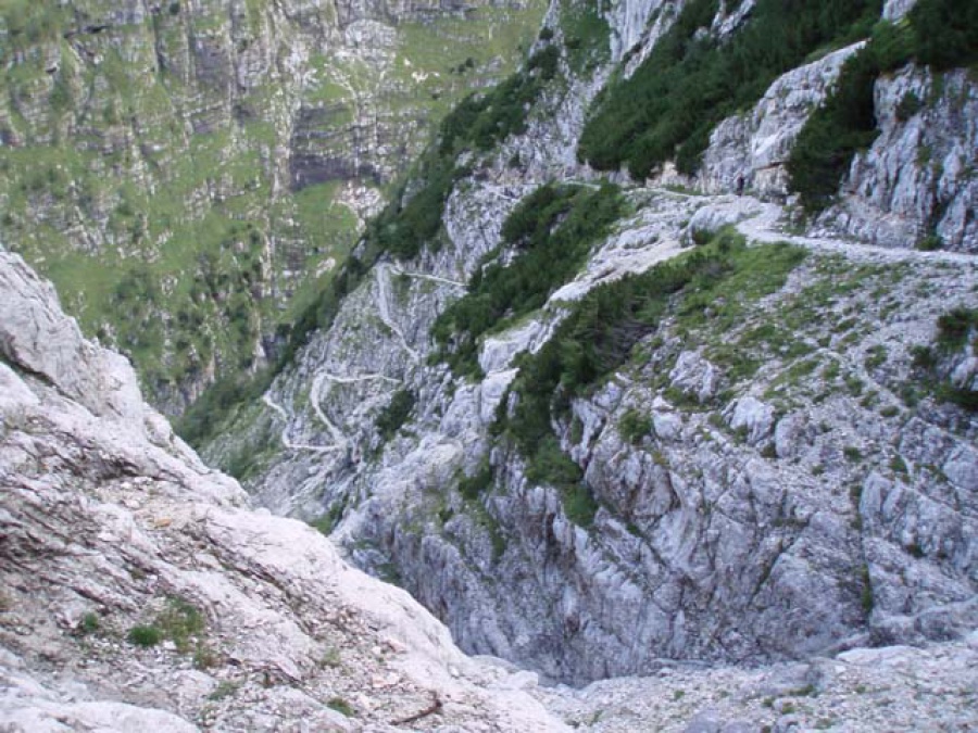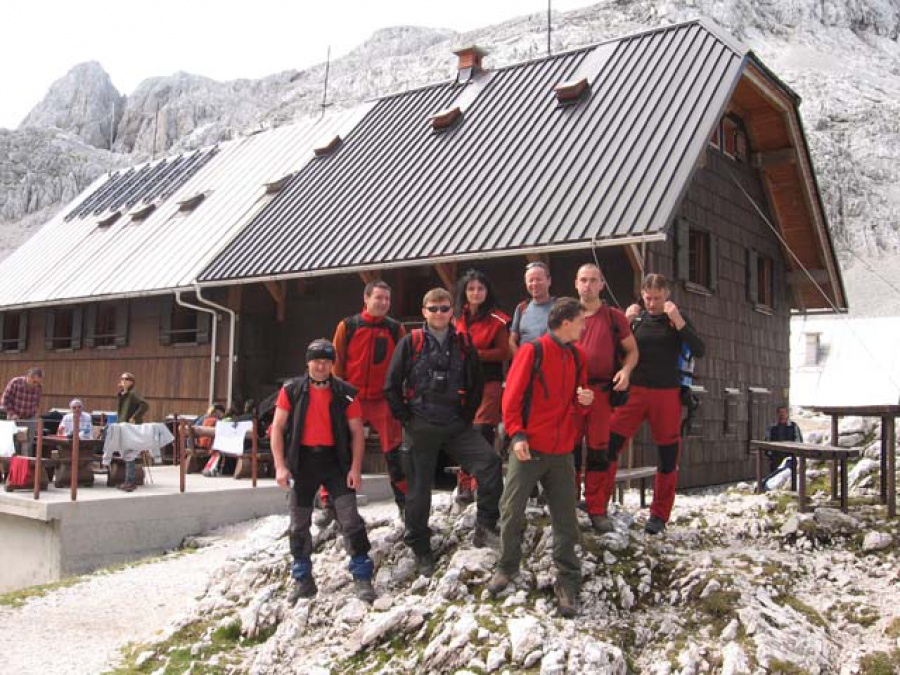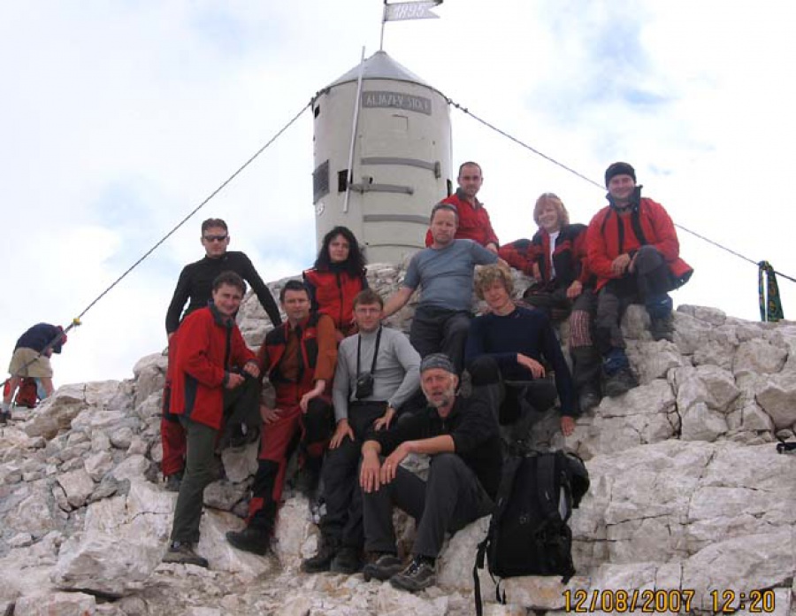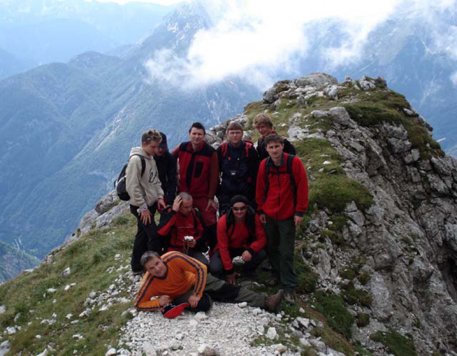 Na ďalší deň budíček o 5.00 h. Náš cieľ je najvyšší vrch Slovinska - Triglav (2 864 m.n.m.), vyrážame z parkoviska pri Trente. Úvod túry vedie cez les, s krásnym výhľadom na kolmé skalné steny okolitých kopcov. Pokračuje chodníkom vytesaným do skaly (urobila ho armáda počas 1. svetovej vojny), ktorým sme sa dostali na chatu Tržaška koča (2 151 m.n.m.) v doline Dolič. Tu si vybaľujeme zásoby a s chuťou sa púšťame do jedenia. Niektorí odvážlivci si objednali ,,polievku" Tomata salata, ale s hrôzou zistili, že to je rajčinový šalát. S plným bruchom vyrážame na Triglav. Cesta na vrchol viedla krátkym suťoviskom, potom na nás čakala istená cesta lanom a kovovými kolíkmi. Podľa nášho názoru sa na vrchol pri dobrej kondícii da vyjsť bez väčších problémov. Z vrcholu máme nádherné slnečné výhľady na okolité štíty. Po krátkom oddychu a jednom "vrcholovom" pri rakete sa vraciame rovnakou cestou späť. Táto túra nás preverila, ako sme na tom kondične.