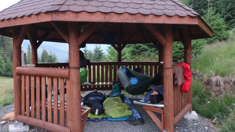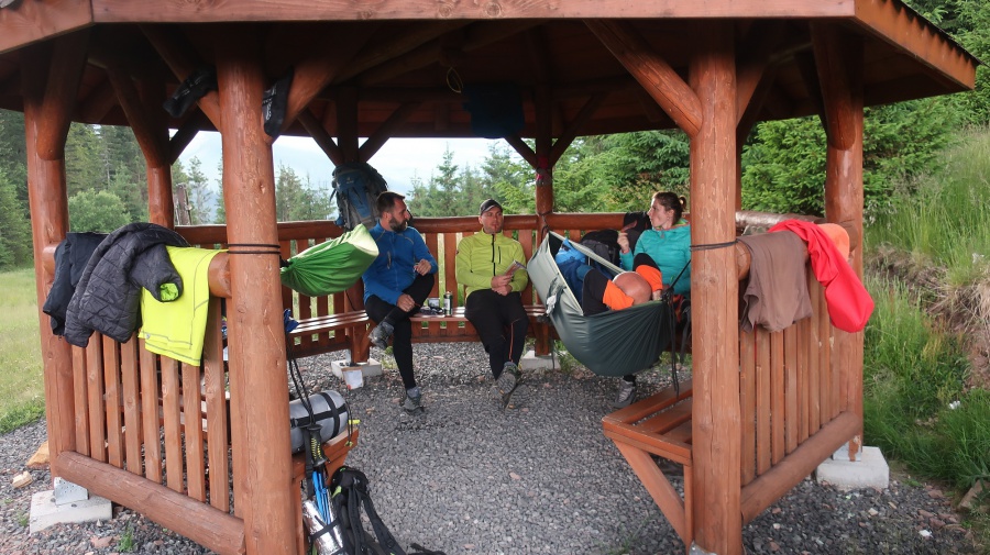 Liptovský Ján ako východiskový bod na Poludnicu (1548 metrov) s nádhernými výhľadmi- odtiaľ na Krakovu hoľu( 1 752m) a zbehnúť dole do doliny kde sme plánovali prespať pod prístreškom a druhý deň vybehnúť naspäť na opačný hrebeň, kde nás čakalo nááádherné Ohnište (1538 m) a vojnu pamätajúce Slemä (1514 metrov). Len vybehnúť a zbehnúť v podstate prvý deň znamenalo prejdených 25km s prevýšením 1900m krásne. 5členná odhodlaná skupina Lenin, Ja, môj Janíčko ( ten bol najmenej odhodlaný ale dal to), Marek V. a Majo R. sme sa s vervou pustili s plne naloženými batohmi do stúpania na Poludnicu. Krásne slnečné počasie, žiadne 30tky našťastie, ani búrky, takže sme si mohli užiť výhľady na Tatry, Choč, Liptovskú maru. Na slniečku sme zadriemali, no pol pol hodine už aj kráčame ďalej, veď máme pred sebou ešte náročný deň. A veruže aj bol, viac ako som čakala. Z Poludnice na Krokovu hoľu to vyzeralo tak, že čo sme nastúpali na Poludnicu, to sme cez nádherné jaskyne, za ktoré by sa ani Dolomity nehanbili museli zase nastúpať. V sedle pod Krakovou hoľou sme nechali ťažké, naložené batohy ( najväčší mal Lenin) a vybehli hore na výhľad. Výhľady nádherné, vody, lesy, okrem výhľadu na Chopok, to je naozaj smutný, vyholený kus Nízkych Tatier. Naklesanie a predieranie sa bujným porastom na Sedlo Javorie, a nižšie k prístreškom v blízkosti Horárne pod Bystrou, kadiaľ vedia aj cyklochodník celou Jánskou dolinou. Polom pri klesaní na červenej značke nám dosť ubral na moráli, ale to sme ešte netušili, že 1. prístrešok na prespanie bude vyzerať, že sa o 5minút zrúti, že 2.hý prístrešok na prespanie vlastne bude krmelec, že k 3.tiemu prístrešku je to ešte viac ako hodina. Nebudem klamať, bol to náročný deň. Pri prameni, ktorý našťastie fičal, že si dali za 2 domácej na posilnenie, nabrali vody, osviežili sa a pokračovali teda ďalej, dúfajúc, že posledná foto prístrešku neklame a budeme mať kde skloniť hlavu na noc. Okolo horárne, okolo salaša do sedla to bolo naozaj cez hodinu, ale zapadajúce slnko a ten pokoj, lúčna vôňa, všetko bolo ako malo. Víťazoslávne OOO super, prístrešok stojí, sme zhodili ťažké ruksaky, uvarili večeru vo variči, a zrazu Lenin z toho obr batohu vyťahuje plechovkové pivá. Skoro som okoktavela, akože v takom prevýšení, KLOBÚK DOLE! Rozložili sme spanie a chvíľu sa rozprávali. Konečne po dlhom čase sa cítim naozaj turisticky unavená a zaspávam. Bojím sa síce medveďov, ale vlastne mi to bolo už jedno. V noci sa budím, musím zo spacáka na wc, ale tá nádherná hviezdna obloha, tisíce, ba milióny ich bolo.