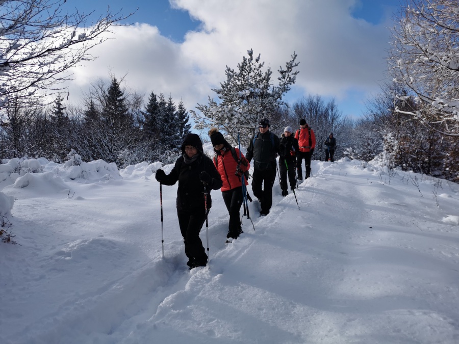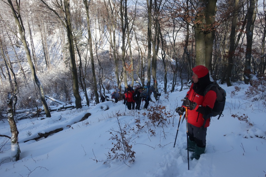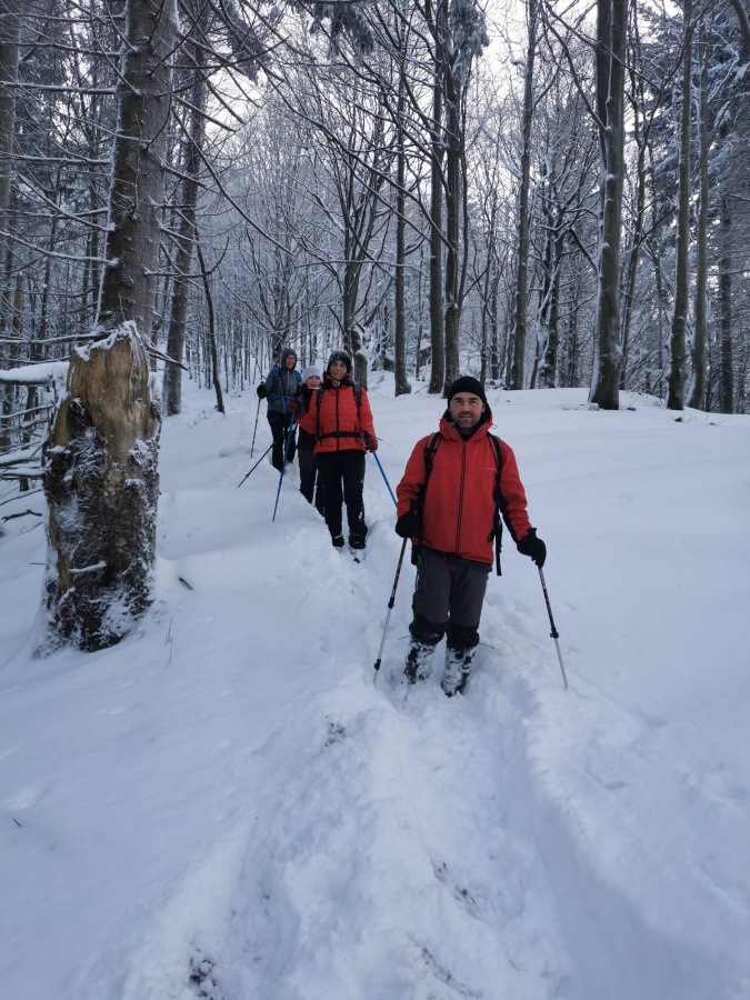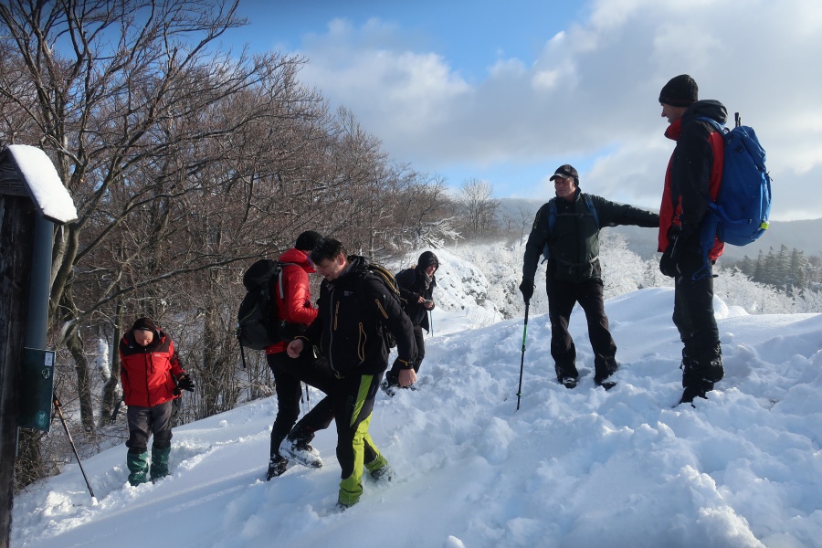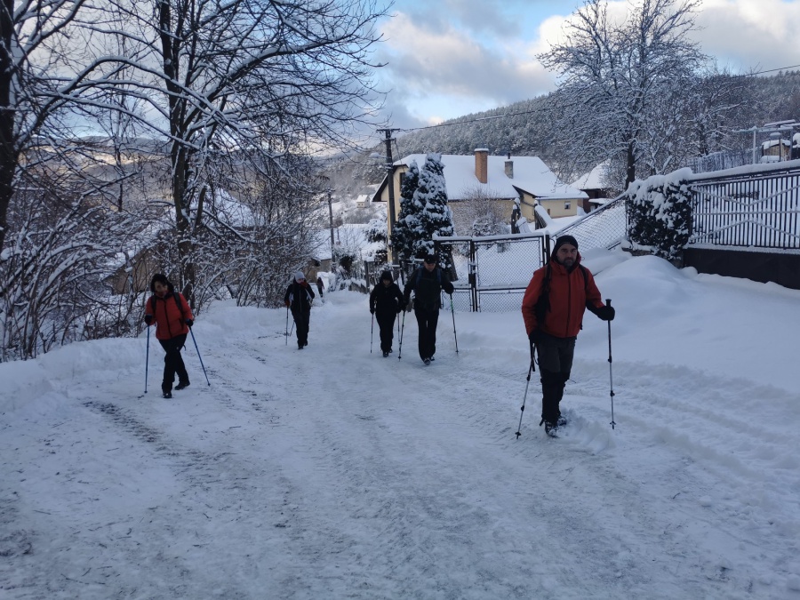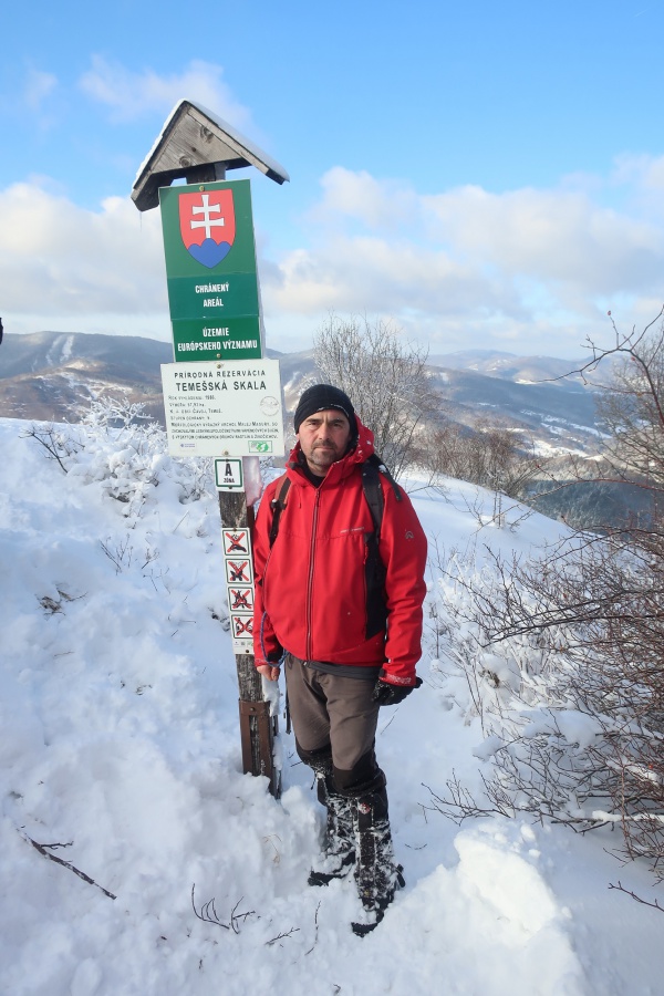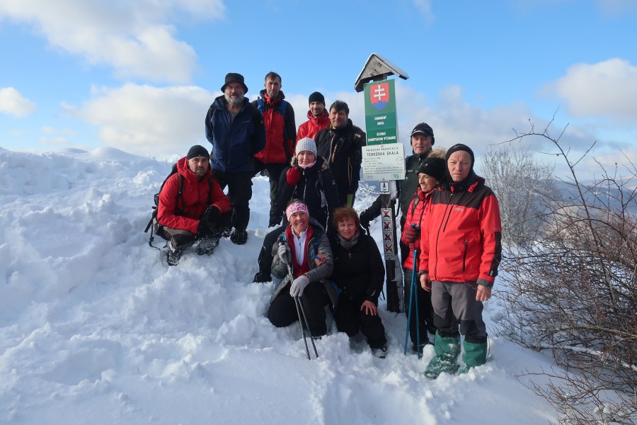 Až koniec januára priniesol výdatnejšie sneženie a to nielen v severnejšej, ale aj južnejšej časti Slovenska. Už pri vstupe do dediny nás zaskočila výška snehu, ktorú práve odhŕňal traktor s radlicou. Našli sme si odhrnuté miesto na parkovanie, kúsok od obecného úradu (nebolo to však jednoduché, lebo sme boli na troch autách). Po krátkom zorientovaní sa, vyrazili sme po žltej turistickej značke smerom na mohutné skalné bralo nad dedinou - Temešská skala. Za dedinou sme stúpali po lúke, ktorú lemoval borovicovo - smrekový lesík. Po vstupe do hustého lesa sa chodník začal strmo dvíhať, čo nám sťažovalo výstup na zľadovatelom povrchu a po chvíľke nás donútilo si nasadiť protišmykové mačky. Asi po hodine výstupu sa nám zjavil smerovník v Temešskom sedle a krátkym výstupom po skalnom teréne sme stáli na vrchole Temešskej skaly, ktorá nám ponúkala nádherné výhľady na Homôlku, Rokoš a vodnú nádrž Nitrianske Rudno. Rovnakou trasou sme sa vrátili do sedla, kde sme pokračovali smerom na Malú Maguru. Hneď na úvod to vyzeralo poriadne divoko, samé popadané stromy krížom krážom nám z výstupu spravili detskú preliezačku. Už len krátky strmý výstup a stáli sme pri smerovníku na Malej Magure. Tu pri pohľade na hodinky, sme zistili, že máme časovú rezervu a pokračovali sme na samotnú Maguru. Tento úsek viedol mierne zvlneným terénom až na najvyšší bod Magury, kde bol osadený drevený dvojkríž. Tu sme naďabili na skupinku miestnych dobrodruhov, ktorý tu bivakovali. Pri návrate na Malú Maguru sa naša skupina rozdelila, vodiči išli naspäť do Temeša pre autá a zbytok skupiny zostupoval prudkým klesaním do Čavoja, kde sme sa stretli a po občerstvení v miestnej ,,reštaurácii,, sme cestovali domov.