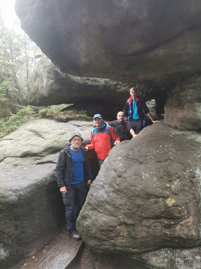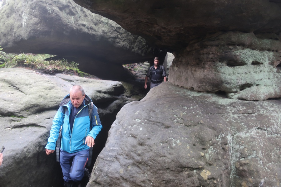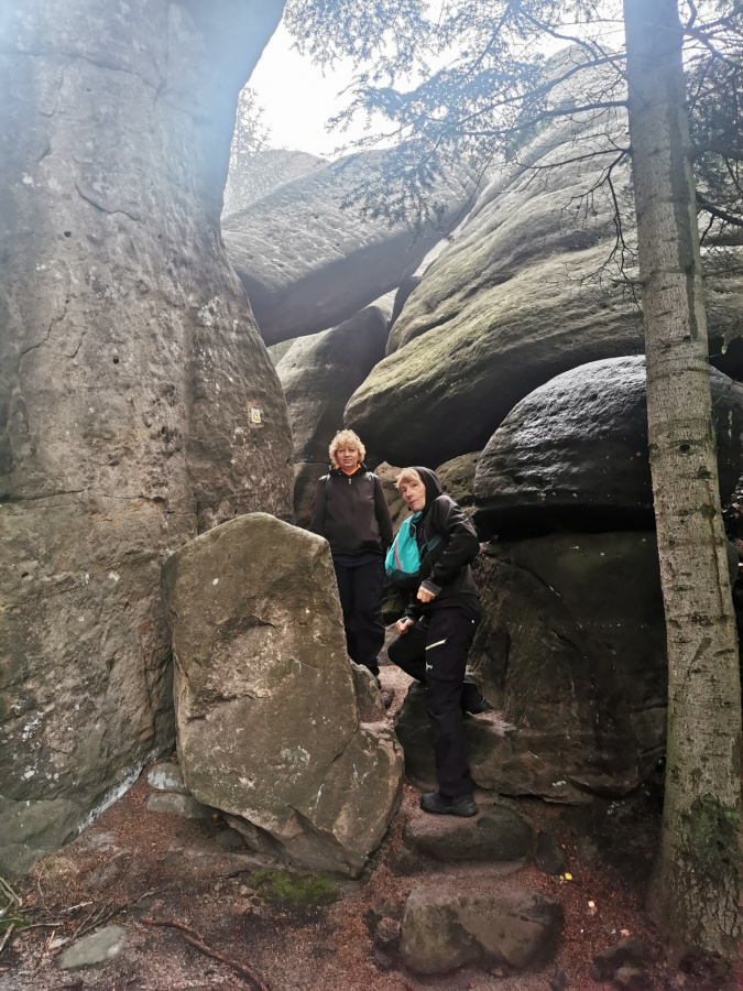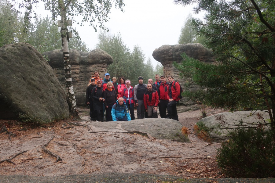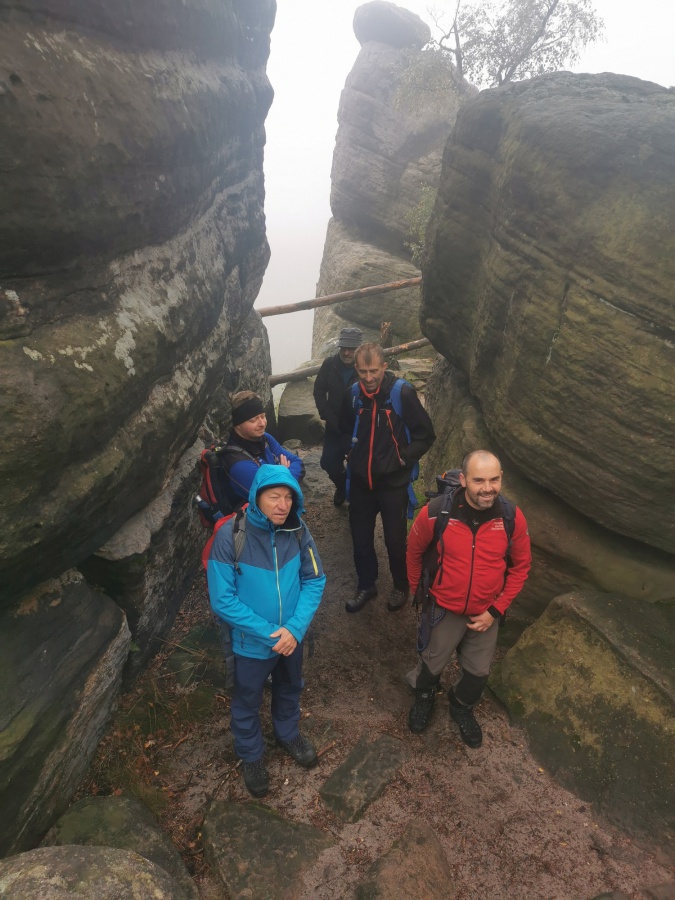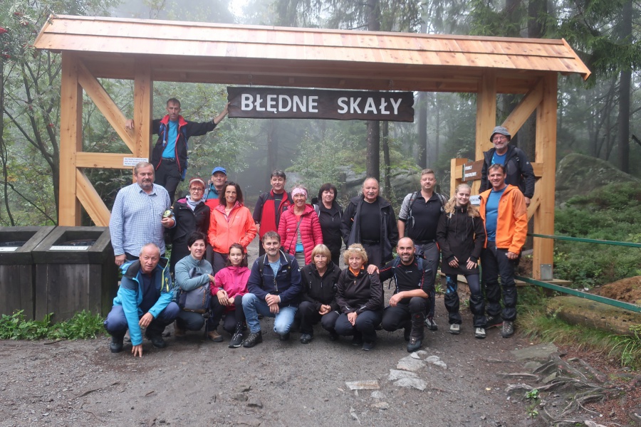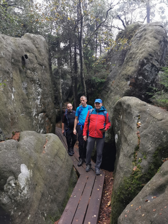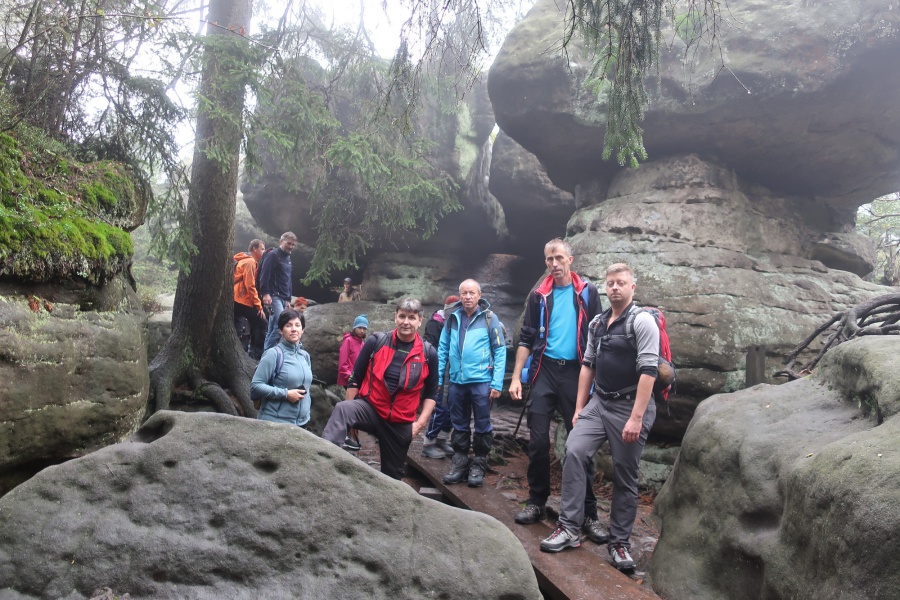 Medzi skalami bol vytvorený turistický okruh, vďaku ktorému sme bez problémov prešli skalným labyrintom a videli sme všetko, čo Bludné skaly môžu ponúknuť. Niektoré priechody v skalách boli také úzke, že tí z nadváhou mali mierne problémy sa tadiaľ pretiahnuť. Nevynechali sme ani výstup na tzv. Skalnú čašu, odkiaľ mali byť výhľady na Veľkú a Malú Hejšovinu (poľsky Szczelinec) , Brumovsko a Máchovsko. Bohužiaľ pre hmlisté počasie, sme si tieto výhľady nemohli dopriať. Okruh nám zabral necelú hodinu. Po presune do obce Karlow, sme sa vybrali zdolať Veľkú Hejšovinu (aj tento okruh bol jednosmerný). Začínali sme z malého parkoviska po žltej turistickej značke a hneď na úvod na nás čakala slušná porcia schodov až k chate na vrchole (Schronisko Na Szczelińcu, 905 m n. m.). Pri chate bolo niekoľko krásnych vyhliadkových miest, ktoré sme nemohli obísť. Po krátkom občerstvení na chate, sme pokračovali do skalného labyrintu, do ktorého sa vchádzalo cez turniket (ďalších 10 zł./osoba). Hneď po vstupe nasledovala vyhliadka z najvyššieho bodu „Veľká Hejšovina” 922 m.n.m., na ktorú sa vychádzalo po rebríku. Nasledovala ďalšia atrakcia s názvom „Peklo”, bola to úzka a tmavá priepasť, cez ktorú mnohý prechádzali so stiesneným pocitom. Po prekonaní ďalších skalných labyrintov a nekonečnými schodmi, sme zišli naspäť na parkovisko k autobusu. Okruh medzi skalami nám trval okolo troch hodín.