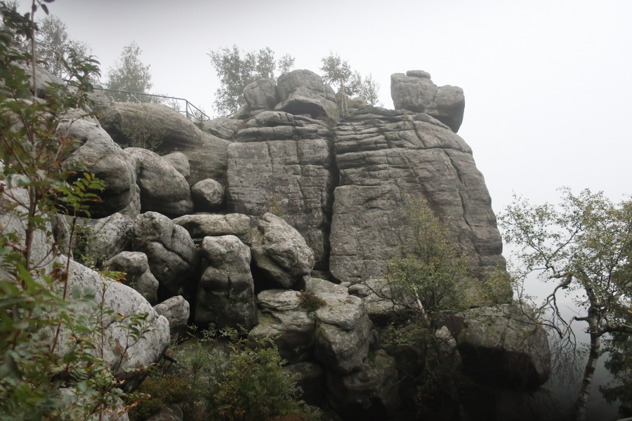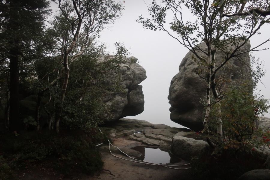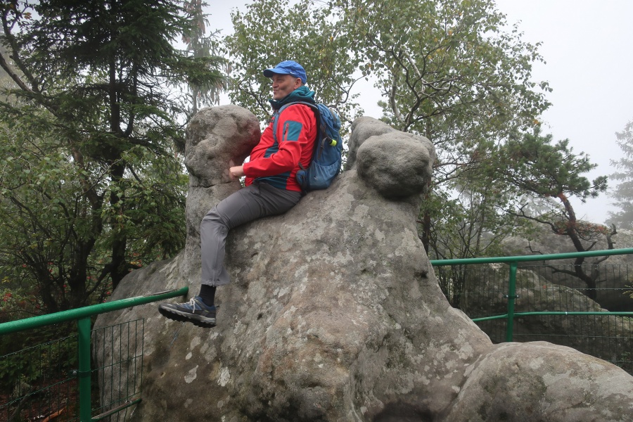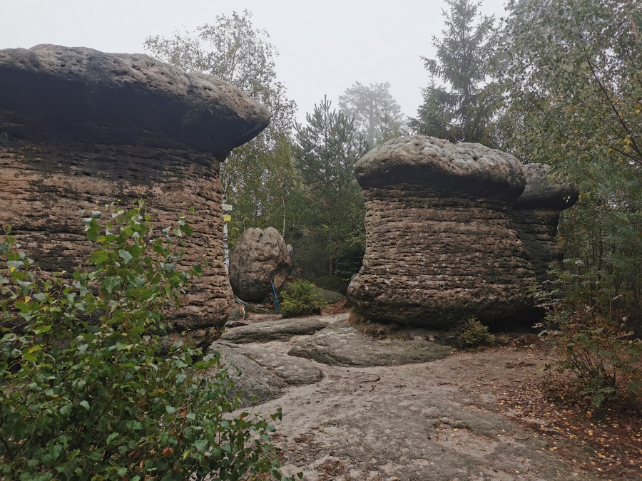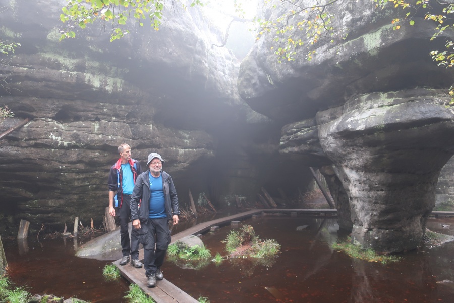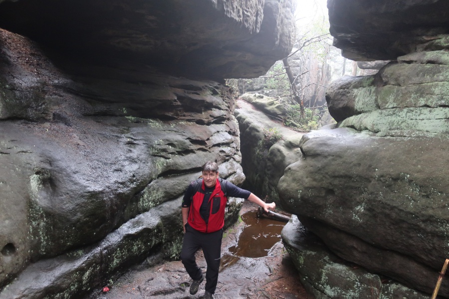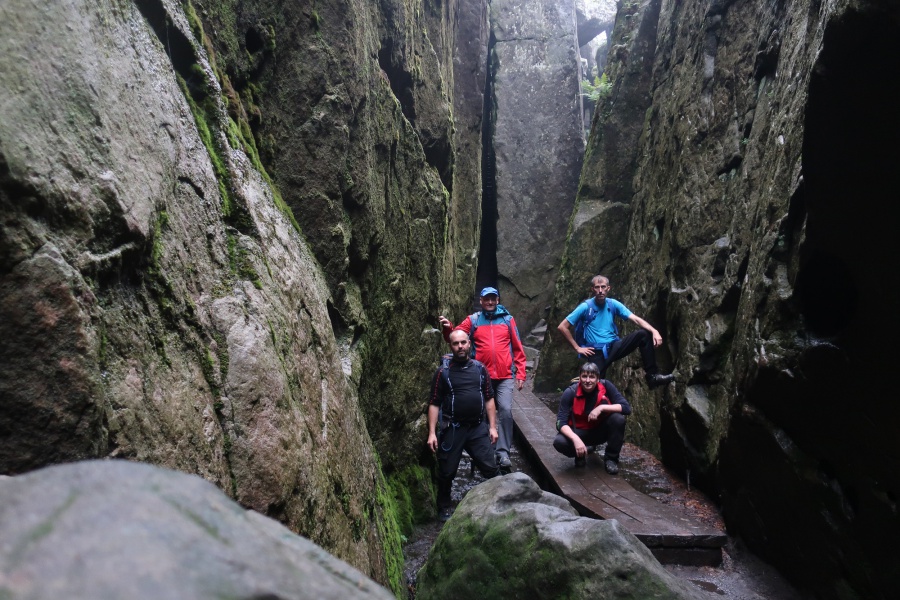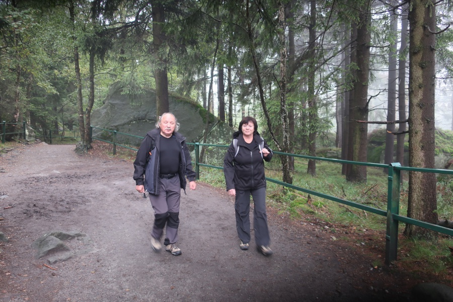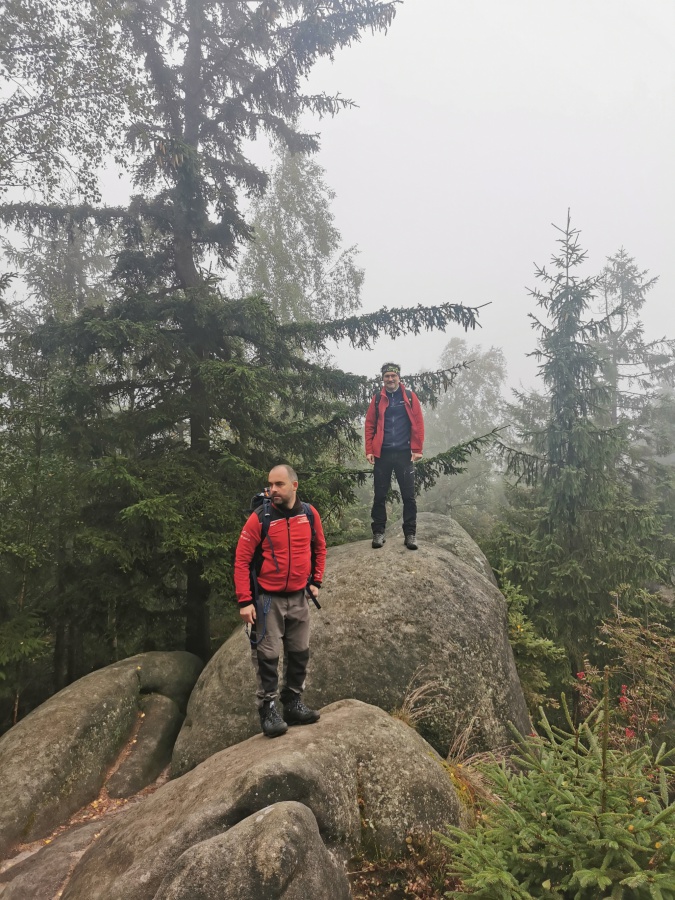 Medzi skalami bol vytvorený turistický okruh, vďaku ktorému sme bez problémov prešli skalným labyrintom a videli sme všetko, čo Bludné skaly môžu ponúknuť. Niektoré priechody v skalách boli také úzke, že tí z nadváhou mali mierne problémy sa tadiaľ pretiahnuť. Nevynechali sme ani výstup na tzv. Skalnú čašu, odkiaľ mali byť výhľady na Veľkú a Malú Hejšovinu (poľsky Szczelinec) , Brumovsko a Máchovsko. Bohužiaľ pre hmlisté počasie, sme si tieto výhľady nemohli dopriať. Okruh nám zabral necelú hodinu. Po presune do obce Karlow, sme sa vybrali zdolať Veľkú Hejšovinu (aj tento okruh bol jednosmerný). Začínali sme z malého parkoviska po žltej turistickej značke a hneď na úvod na nás čakala slušná porcia schodov až k chate na vrchole (Schronisko Na Szczelińcu, 905 m n. m.). Pri chate bolo niekoľko krásnych vyhliadkových miest, ktoré sme nemohli obísť. Po krátkom občerstvení na chate, sme pokračovali do skalného labyrintu, do ktorého sa vchádzalo cez turniket (ďalších 10 zł./osoba). Hneď po vstupe nasledovala vyhliadka z najvyššieho bodu „Veľká Hejšovina” 922 m.n.m., na ktorú sa vychádzalo po rebríku. Nasledovala ďalšia atrakcia s názvom „Peklo”, bola to úzka a tmavá priepasť, cez ktorú mnohý prechádzali so stiesneným pocitom. Po prekonaní ďalších skalných labyrintov a nekonečnými schodmi, sme zišli naspäť na parkovisko k autobusu. Okruh medzi skalami nám trval okolo troch hodín.