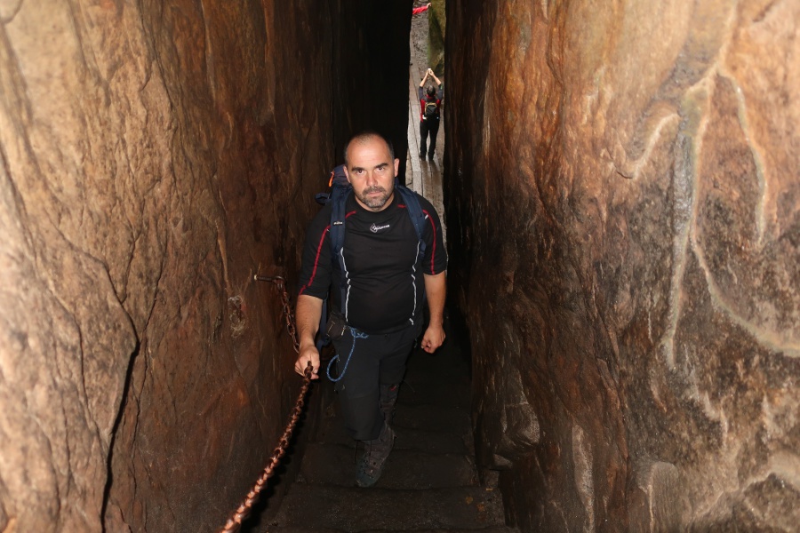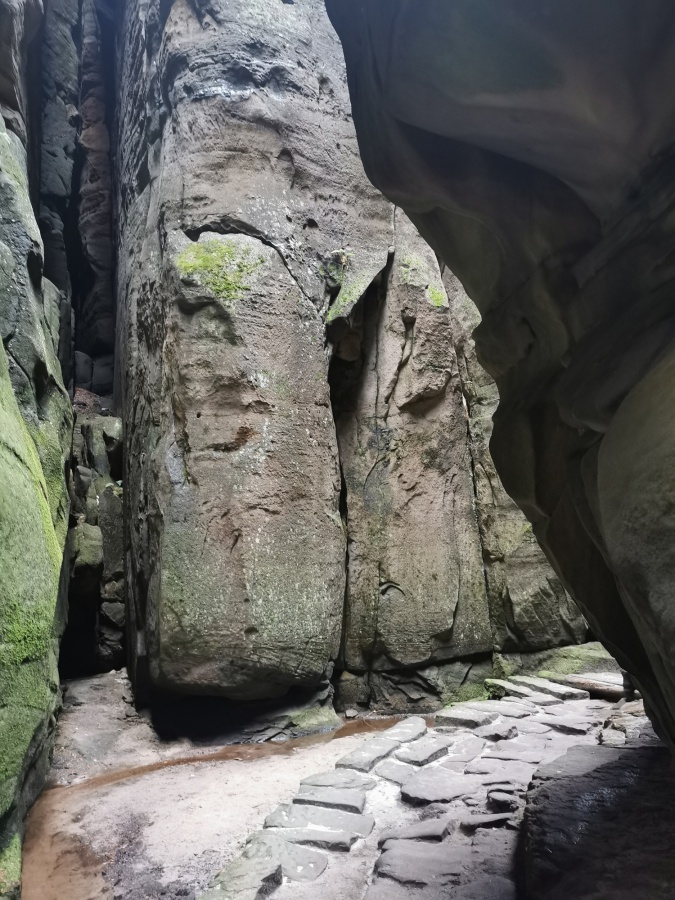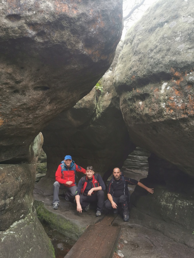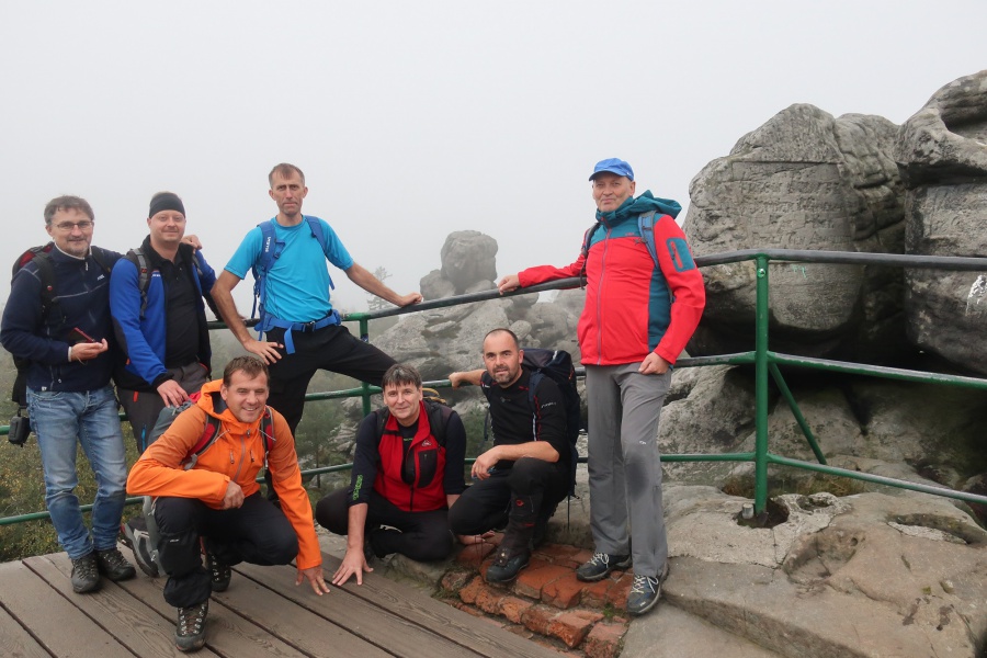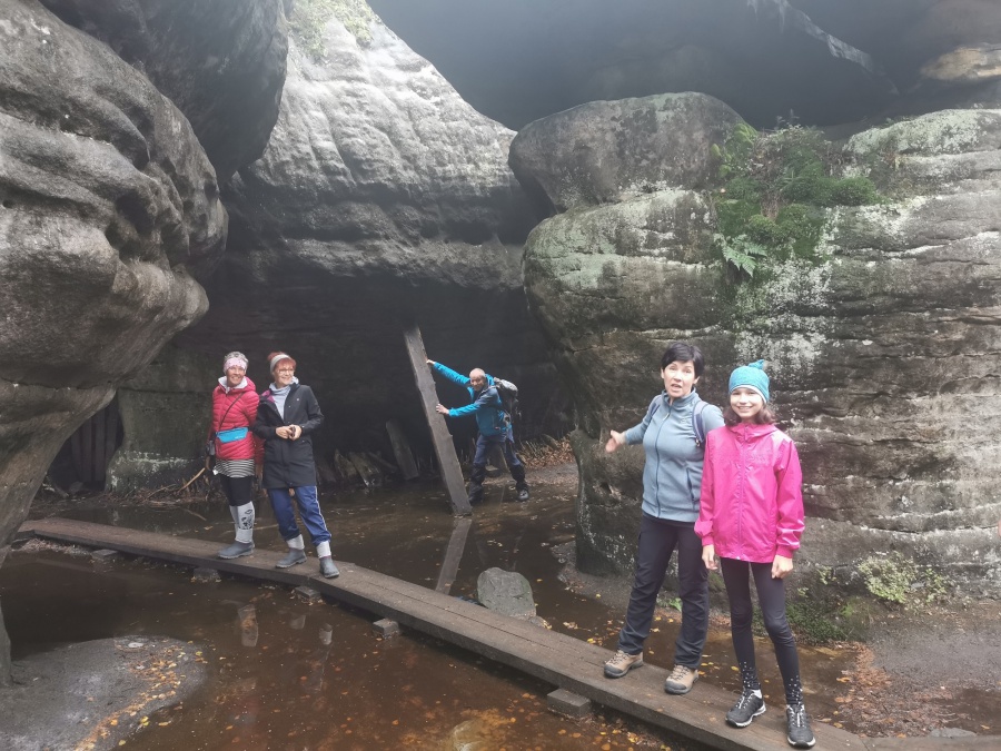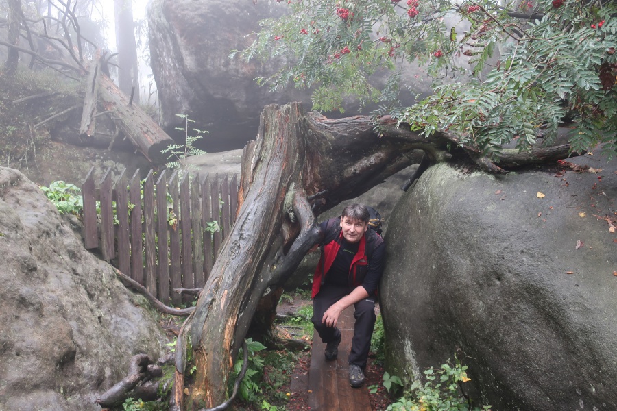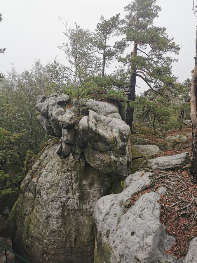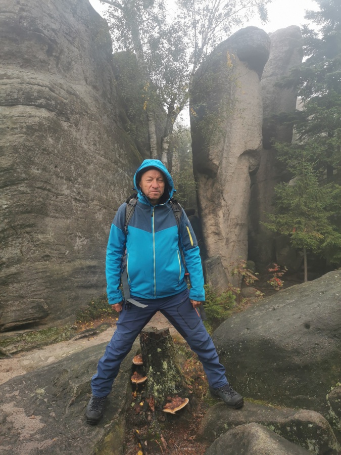 Medzi skalami bol vytvorený turistický okruh, vďaku ktorému sme bez problémov prešli skalným labyrintom a videli sme všetko, čo Bludné skaly môžu ponúknuť. Niektoré priechody v skalách boli také úzke, že tí z nadváhou mali mierne problémy sa tadiaľ pretiahnuť. Nevynechali sme ani výstup na tzv. Skalnú čašu, odkiaľ mali byť výhľady na Veľkú a Malú Hejšovinu (poľsky Szczelinec) , Brumovsko a Máchovsko. Bohužiaľ pre hmlisté počasie, sme si tieto výhľady nemohli dopriať. Okruh nám zabral necelú hodinu. Po presune do obce Karlow, sme sa vybrali zdolať Veľkú Hejšovinu (aj tento okruh bol jednosmerný). Začínali sme z malého parkoviska po žltej turistickej značke a hneď na úvod na nás čakala slušná porcia schodov až k chate na vrchole (Schronisko Na Szczelińcu, 905 m n. m.). Pri chate bolo niekoľko krásnych vyhliadkových miest, ktoré sme nemohli obísť. Po krátkom občerstvení na chate, sme pokračovali do skalného labyrintu, do ktorého sa vchádzalo cez turniket (ďalších 10 zł./osoba). Hneď po vstupe nasledovala vyhliadka z najvyššieho bodu „Veľká Hejšovina” 922 m.n.m., na ktorú sa vychádzalo po rebríku. Nasledovala ďalšia atrakcia s názvom „Peklo”, bola to úzka a tmavá priepasť, cez ktorú mnohý prechádzali so stiesneným pocitom. Po prekonaní ďalších skalných labyrintov a nekonečnými schodmi, sme zišli naspäť na parkovisko k autobusu. Okruh medzi skalami nám trval okolo troch hodín.