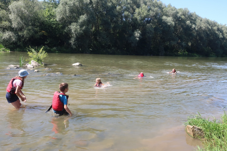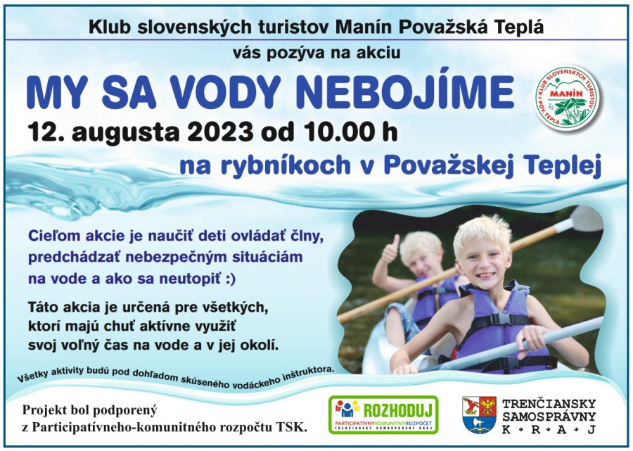 Za teplého a slnečného počasia sa zišlo v sobotu 12.8.2023 o 10.00 hod. na rybníkoch v Považskej Teplej 165 účastníkov tohto projektu, z toho 72 detí. Po prvotných organizačných pokynoch začal samotný výcvik, ktorý organizoval skúsený vodácky inštruktor z Liptovského Mikuláša. Najskôr ukazoval, ako sa má správne obliecť záchranná vesta, potom nasledoval výcvik na suchu (správne držanie pádla, nastupovanie do lodí, posed na lodi a zachraňovanie osôb, ktoré vypadnú z lode). Po nadobudnutí teoretických vedomostí, sme sa odobrali na rybník, kde sa začalo praktické učenie na vode. Po úvodných nesmelých začiatkoch, sa na vodu dostali všetky deti. Po dvoch hodinách strávených na rybníku, sa tí odvážnejší odobrali s nami na splav rieky Váh v úseky Plevník Drienové – Považská Teplá. Tí nesmelší sa zostali naďalej člnkovať na rybníkoch pod dohľadom svojich rodičov. Na záver splavu niektoré deti nabrali odvahu a vykúpali sa v rieke.