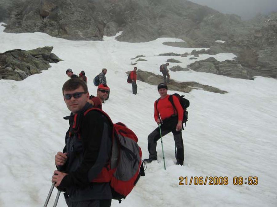 Prvý deň sme sa rozhodli zdolať vrchol Mt. Vioz (3 646 m. n. m.), zatiaľ čo inštruktori raftingu sondovali možné splavovanie rieky Noce. Na pochod vyrážame z dedinky Pejo. Úvod trasy viedol lesom až po farmu MGA Saline (2 089 m. n. m.). Nad farmou sa začal terén trasy meniť na skalný. Vo svižnom tempe prekonávame ďalších 500 výškových metrov. Ďalej pokračujeme už opatrne, príčinou je nadmerné množstvo snehu, v niektorých miestach sa v ňom boríme až po pás. Vystupujeme do výšky 3 500 metrov. Ďalej to už nejde, nepomôžu nám ani paličky, okolo nás sa zosúvajú malé doskové lavíny. Tu končí naše snaženie. Po krátkom odpočinku, spestrenom krásnymi výhľadmi po okolí, sa vydávame na zostup. Na spiatočnej ceste sa zastavujeme na chate Rif. Dos dei Cembri, kde stretávame skupinku českých turistov.