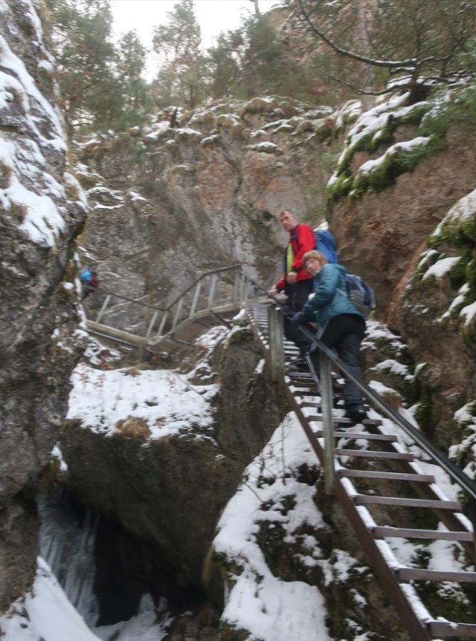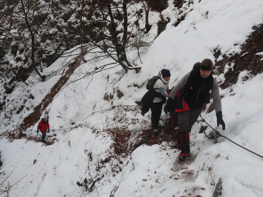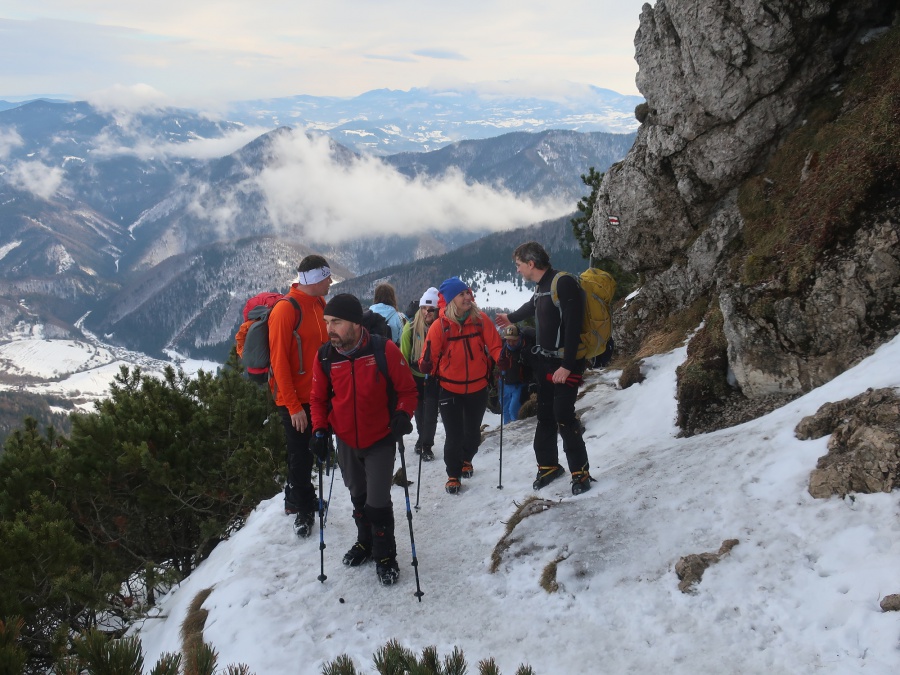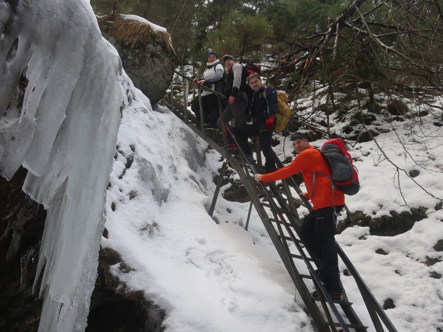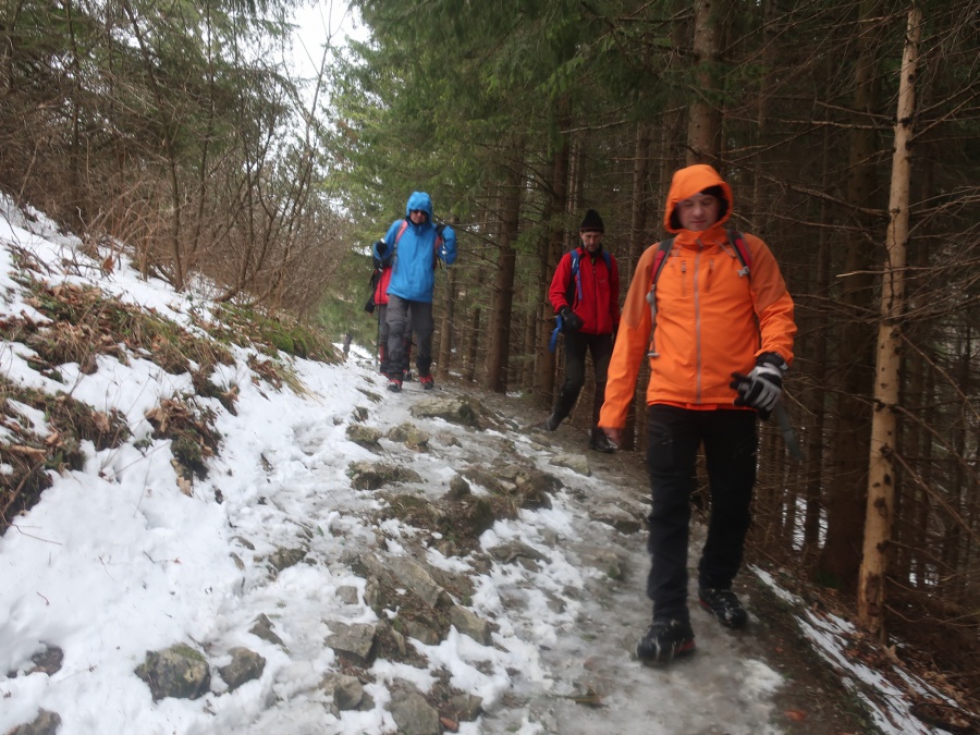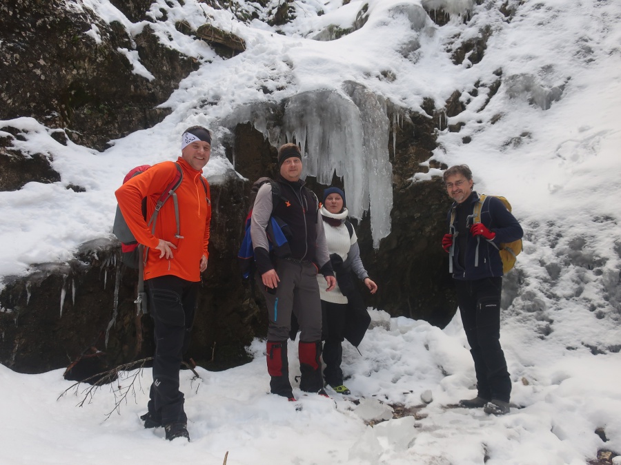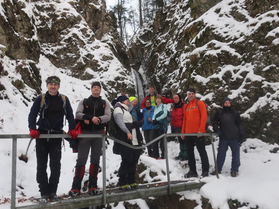 Početná dvanásť členná skupina sme vyrazili na túru z obce Štefanová a po polhodinke sme stáli u smerovníka Podžiar, odkiaľ začínala vstupná brána do Horných Jánošíkových dier. Hneď od začiatku sa nám začalo na rebríkoch šmýkať, preto sme nasadili „nešmeky”. V tejto časti dier nám to hodne pripomínalo Slovenský raj. Dlhé a vysoké rebríky poskytovali zaujímavé pohľady na vodopády – jediná škoda, že neboli celkom zamrznuté. Dlhšiu prestávku na občerstvenie a oddych sme si spravili až v sedle Medzirozsutce, odkiaľ nás čakal záverečný prudký výstup na vrchol Veľkého Rozsutca s prevýšením cca 400 výškových metrov. Tento rok nebolo veľa snehu, preto nám pri výstupe nehrozilo žiadne lavínové nebezpečenstvo. Na vrchole sme sa dlho nezdržali kvôli sychravému počasiu. Aj hmla nám zabránila sa pokochať výhľadmi do okolia. Zostup sme nasmerovali na Medziholie a odtiaľ do cieľa na parkovisko v obci Štefanová.