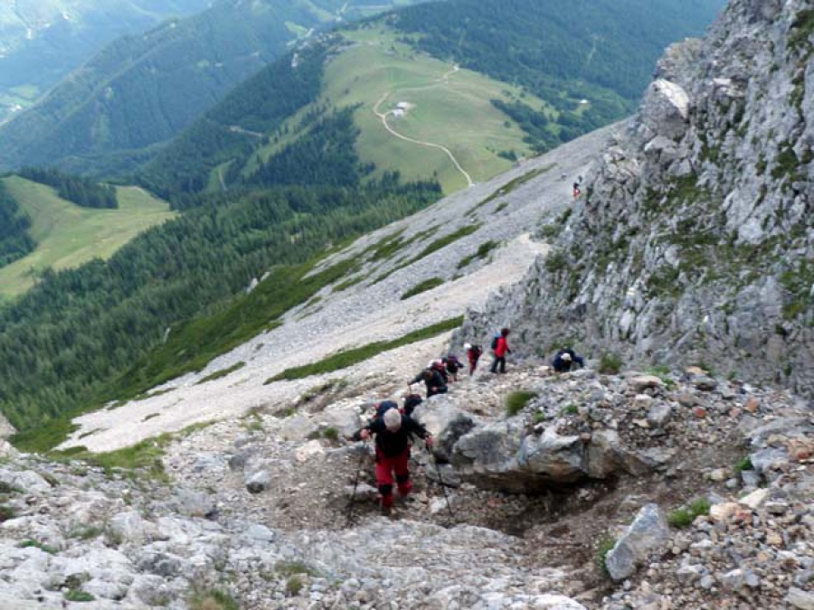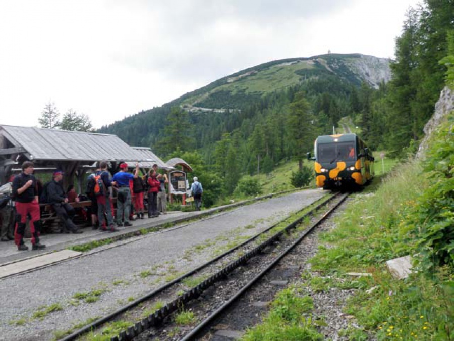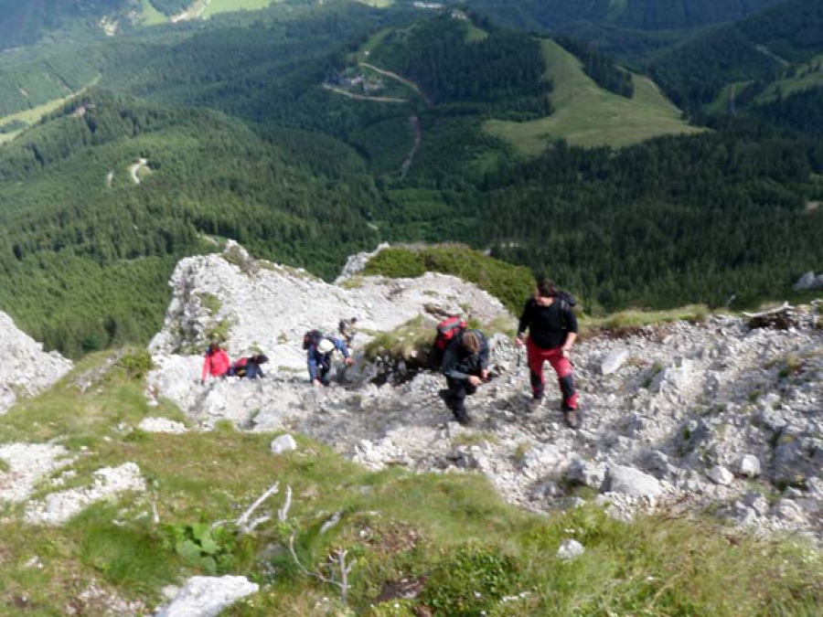 Až záverečné prudké stúpanie v skalnom teréne preverilo naše schopnosti. Onedlho sme však vystúpali na prvý z dvoch vrcholov Kaiserstein (2.076 m n. m.). Po krátkom občerstvení na vysokohorskej chate Fischerhűtte pokračujeme na druhý z vrcholov. Po výstupe na najvyšší bod sa nám otvorili nádherné výhľady na okolité vrchy. Prudký vietor a začínajúci chlad urýchlil náš zostup. Ako zostupovú trasu do Schneebergdofrlu sme zvolili chodník okolo zubačkovej dráhy nazývanej Salamander.