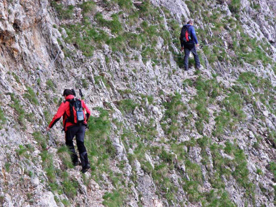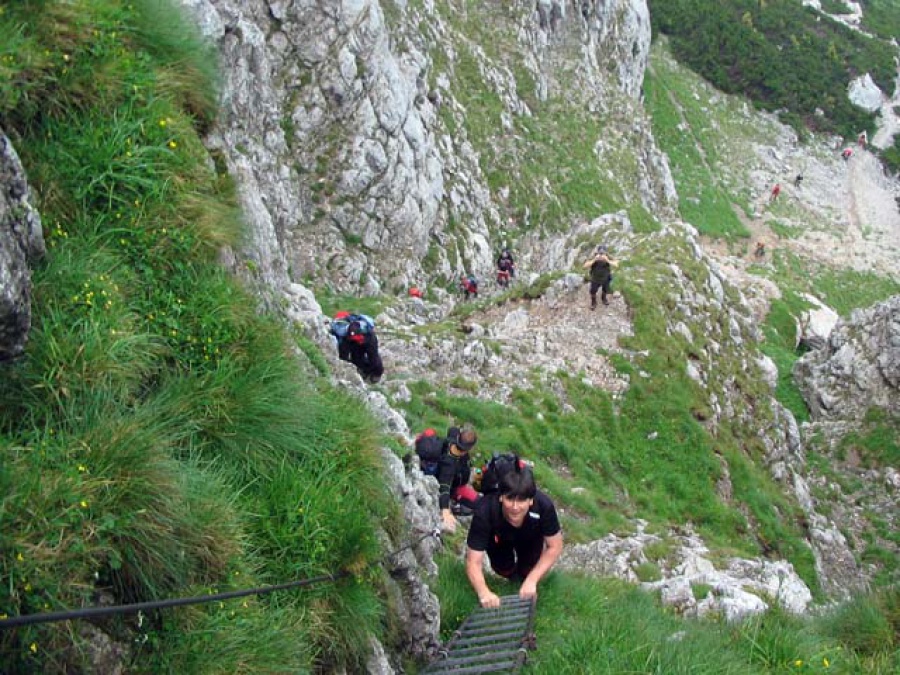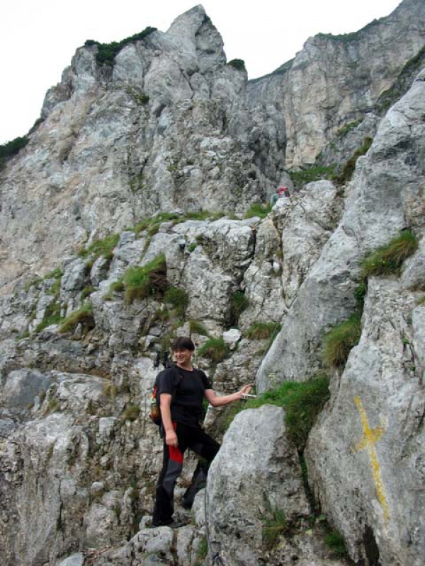 Parkovisko v sedle Preiner Gscheid opúšťame po žltej turistickej značke. Cesta stúpa lesom a po chvíli míňame chatu Reisstaler Hutte, v ktorej sa zdalo, akoby nebol žiaden život. Pokračujeme širokým chodníkom popod chatu a pri najbližšom smerovníku sa chodník prudko stáča doprava, začíname naberať výšku. Konečne sa dostávame do pásma kosodreviny, kde sa nám naskytli prvé výhľady do doliny, ale zároveň nám aj prezrádzala, čo všetko máme ešte pred sebou. Strmým, kľukatým chodníkom sa dostávame ku skalám, kde začína ferrata.