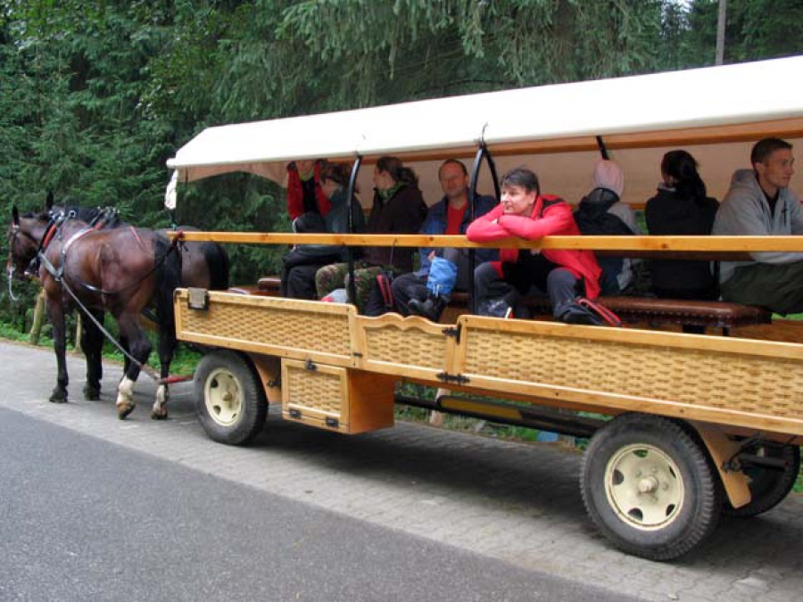 Hneď na úvod pobytu sme zdolali nesporne najnavštevovanejší tatranský vrchol - Rysy. Keďže leží na slovensko-poľskej štátnej hranici, rozhodli sme sa vystúpiť na vrchol od Morského oka. Je to celodenný a kondične náročnejší výstup ako zo slovenskej strany. Skoro ráno, ešte pred šiestou, prechádzame štátnu hranicu cez Lysú Poľanu. Auto nechávame na parkovisku Polana Palenica (ďalej sa už nesmie ísť, pretože je tam závora ohraničujúca TPN). Pre ušetrenie času (čo nie je pravda) a síl sa nechávame ukecať na odvoz koňským záprahom na Morské oko. Posilnení kofeínom z kávy, ktorú sme vypili na chate, vyrážame v ústrety vrcholu. Po červenej značke sa dostávame na Czarny Staw, kde obiehame početnú poľsky hovoriacu skupinu turistov. Nezastavujeme sa, pretože nás čakajú tri hodiny výstupu po kamenných schodoch na Rysy. Záverečná tretina výstupu je istená reťazami.