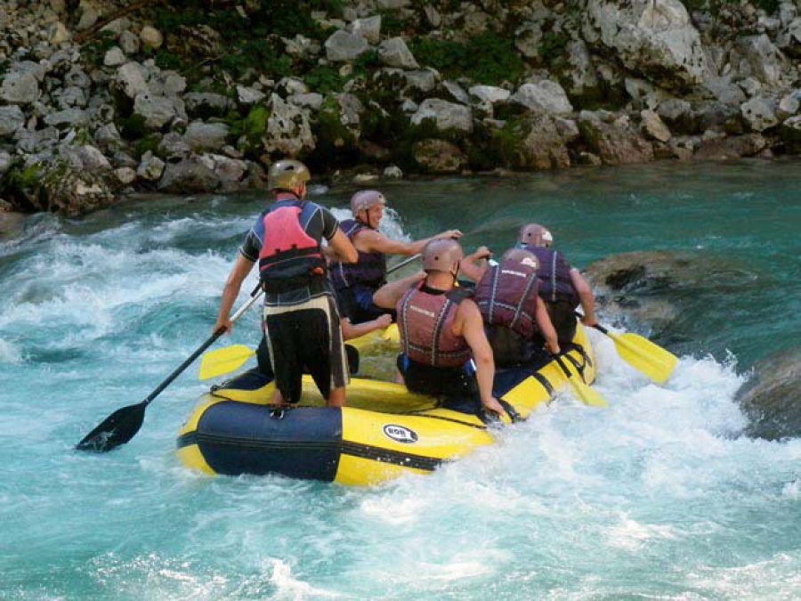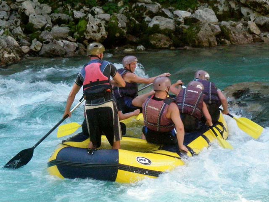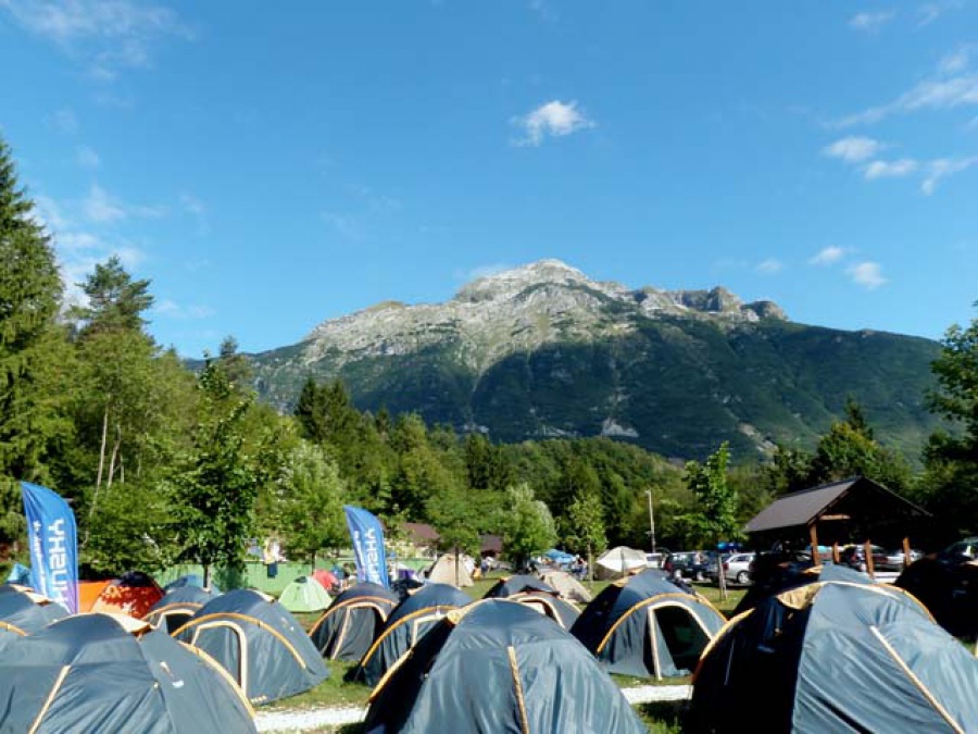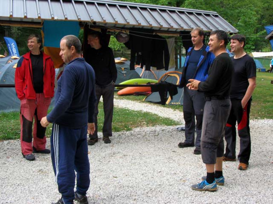 Prvý adrenalín prišiel pri prekonávaní horského priesmyku medzi Talianskom a Slovinskom. Ostré zákruty, úzka cesta a drevené zvodidlá, ktoré by podľa nás nezadržali ani kolobežku, dávali poriadne zabrať našim žalúdkom. Našťastie všetko dobre dopadlo, a tak sme o polhodinku boli tesne pred cieľom – kempom Vodenca. „Čakajú nás medzi ôsmou a deviatou, všetko je dohodnuté,“ ubezpečoval nás Dušan. Nebolo. V kempe o nás nikto ani netušil. „To je normálne, pravdepodobne zlyhala komunikácia medzi majiteľom cestovky a jeho synom,“ neisto dodáva. „Začína sa to pekne,“ pomysleli sme si, „dnes z plánovaného raftingu asi nič nebude“. Veľmi rýchlo sme však pochopili, že život v kempe plynie zo dňa na deň a na takéto prekvapenia sú tu zvyknutí. Za pár minút sme mali pridelené erárne stany, nafasovali sme neoprény, prilby a záchranné vesty a do hodiny sme boli pri vode s dvoma raftmi a inštruktormi.
