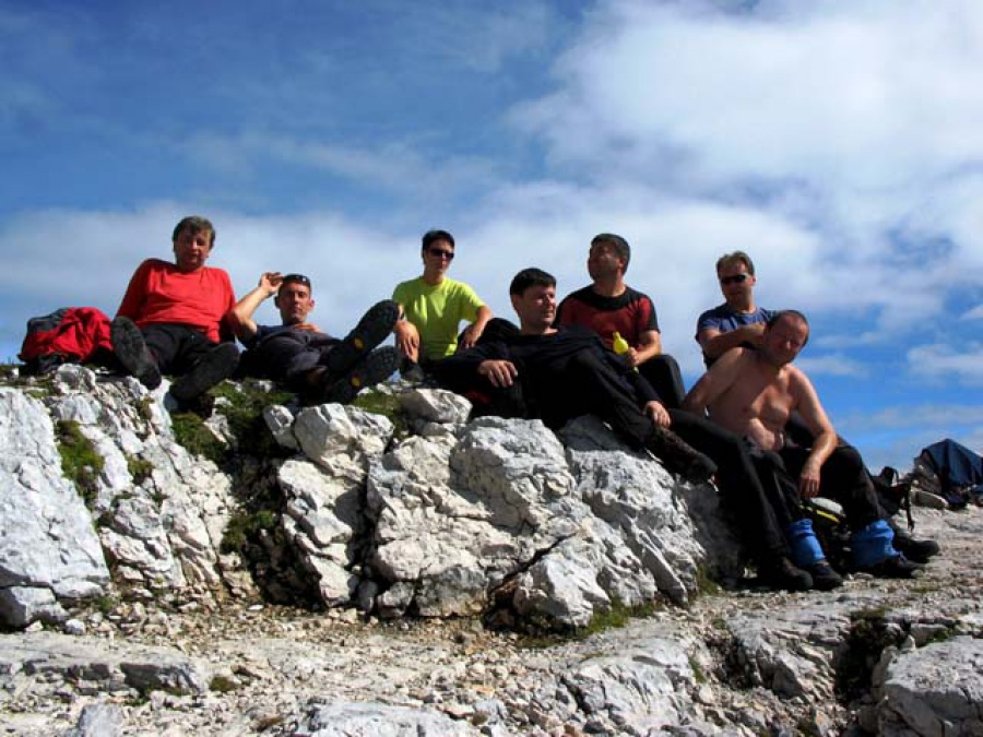 V sobotu sme si za cieľ určili 2587 metrov vysoký Kanín. Na jeho vrchole ešte z našej skupiny nestál nikto. Pre nestále počasie a hroziace búrky popoludní, sme si cestu hore uľahčili lanovkou. Aj tak to bol náročný výstup, ktorý preveril každého z nás. Žľaby so snehom, suťoviská, slabo istené náročné miesta... . Zhodli sme sa, že u nás by takúto trasu ťažko niekto povolil. Pohľad z vrcholu však stál za to. Na jednej strane Jadranské more, na druhej nekonečná spleť alpských dolín a vrcholov. To treba zažiť! 6-hodinový zostup až do doliny bol minimálne rovnako náročný ako výstup. Na jednom šmykľavom mieste si to odniesla Rudova ruka. Našťastie mastička zvonku a poldeci domácej zvnútra urobili svoje a na druhý deň sme mohli ísť v plnom počte opäť na vodu.