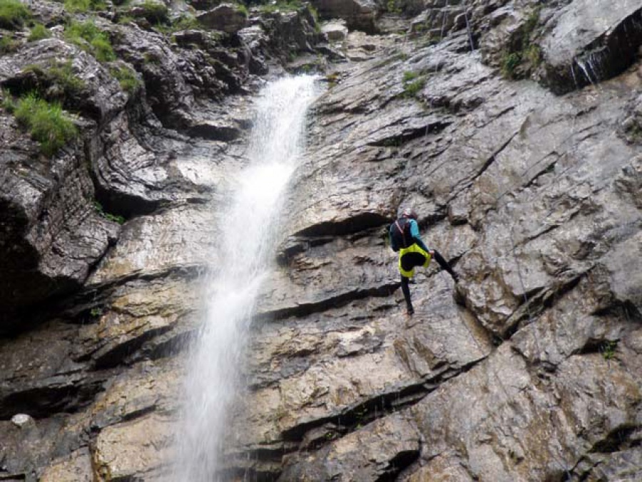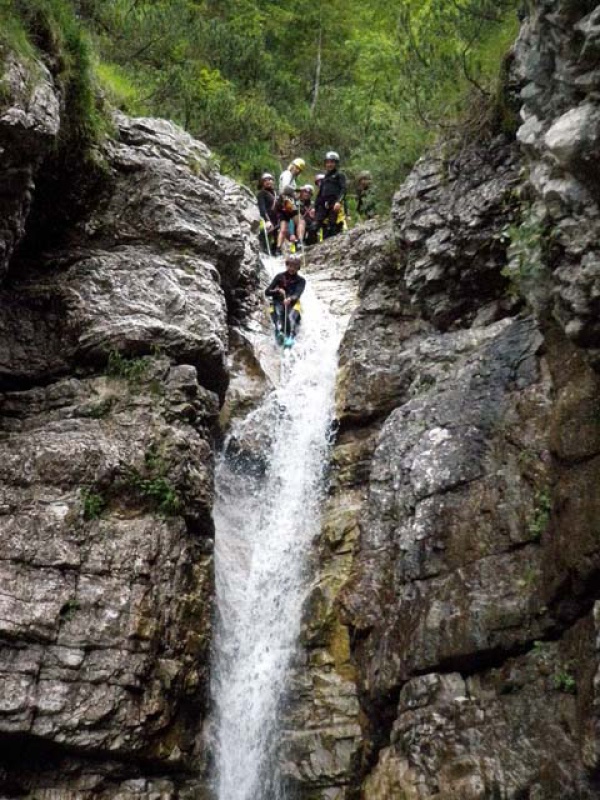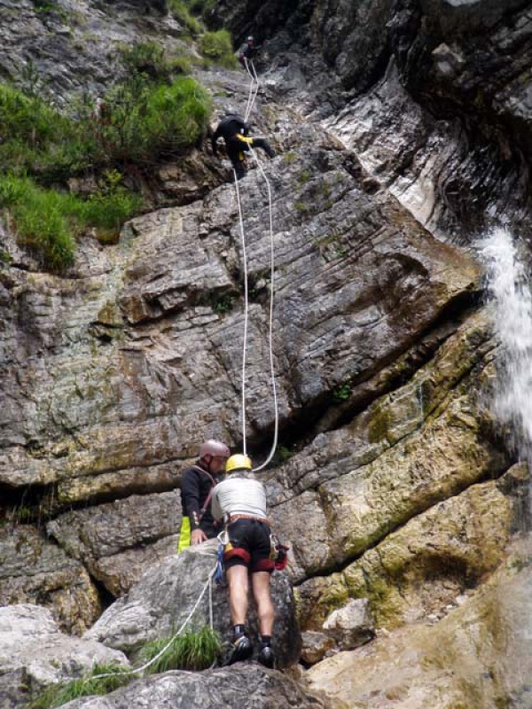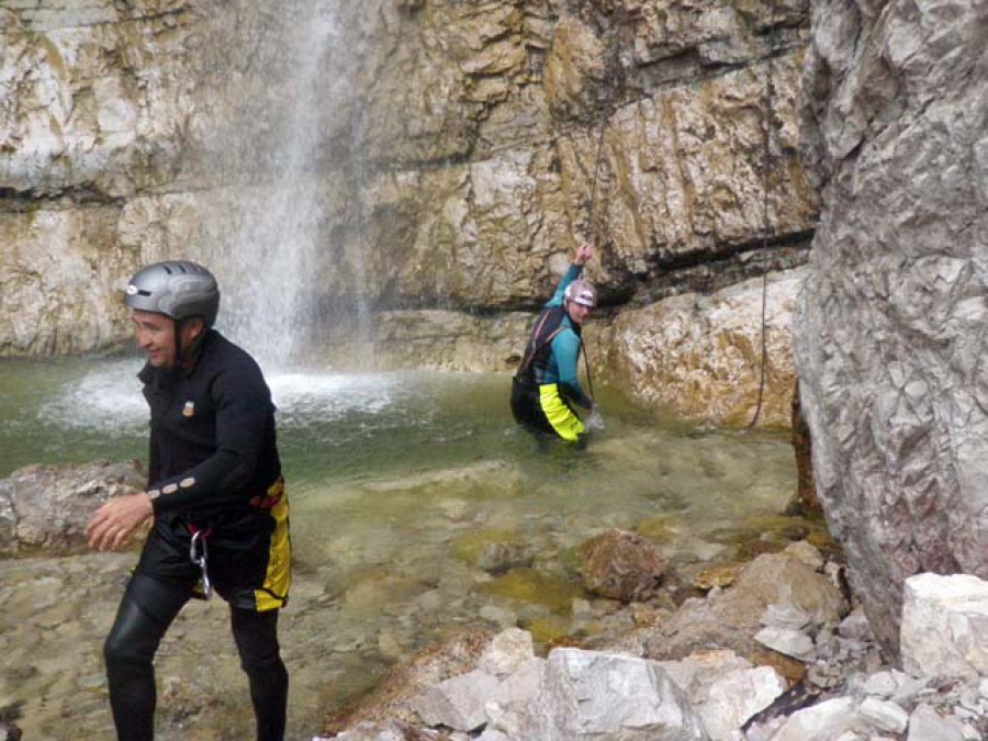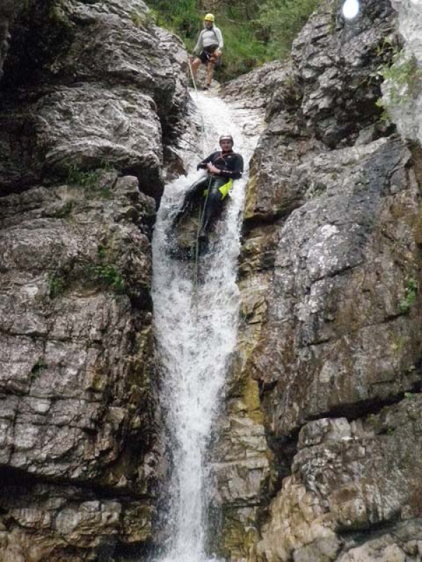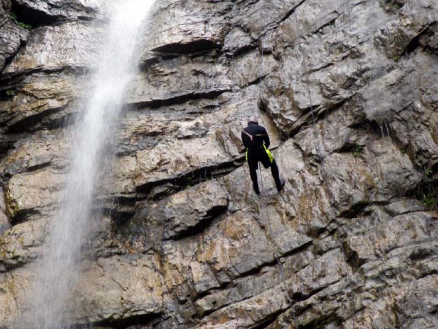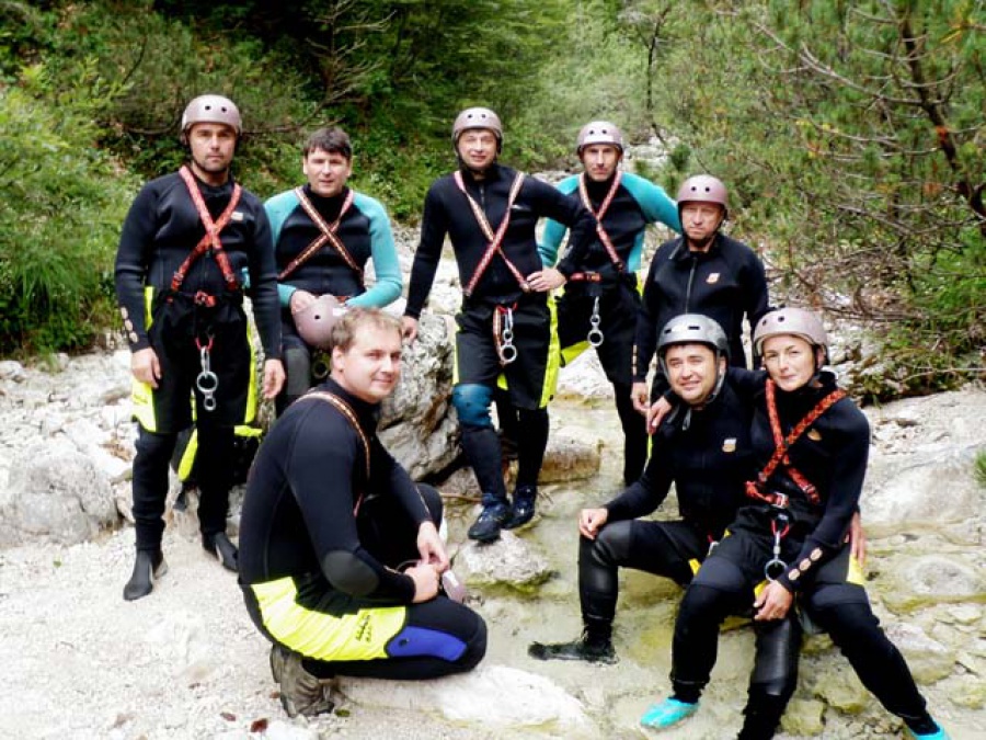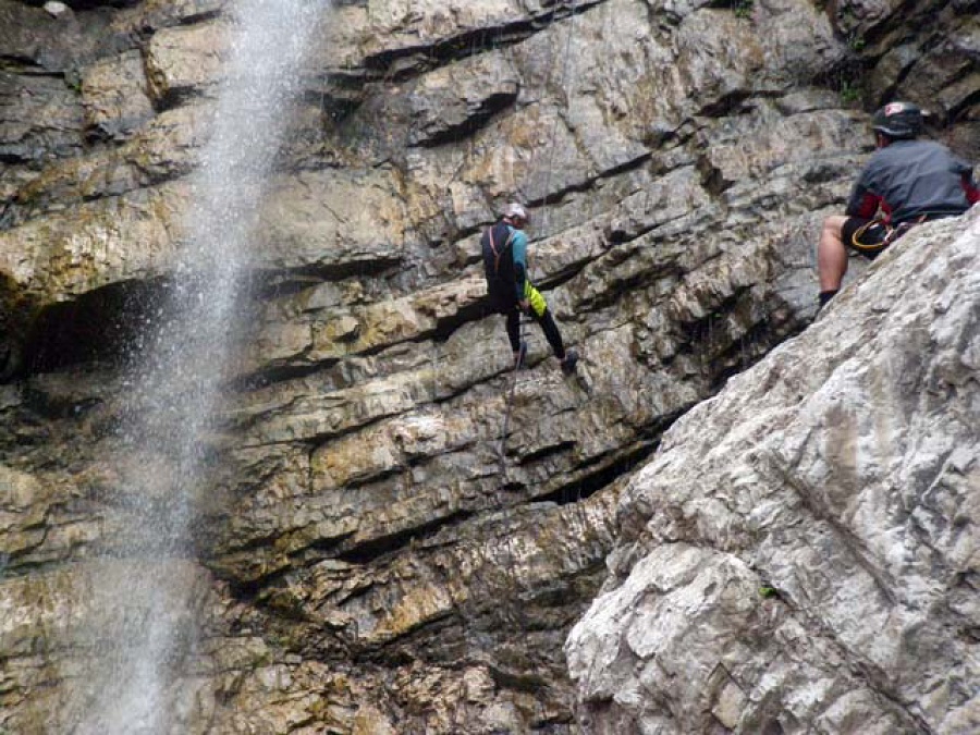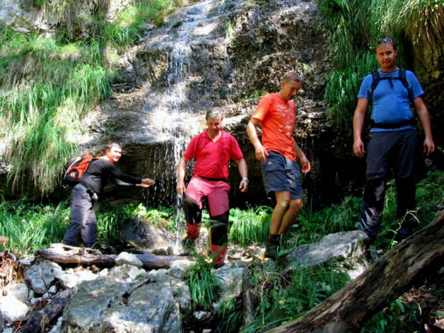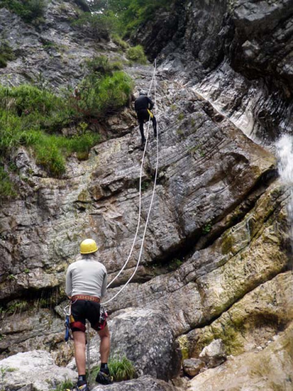 Na druhý deň nás čakal adrenalín v podobe kaňoningu. Nám nováčikom to veľa nehovorilo. Tušili sme, že budeme zliezať nejakým potokom. „Nebojte sa, všetky ťažšie úseky sa dajú obísť,“ radili nám skúsení mazáci. Doteraz nevieme, či klamali vedome alebo tiež netušili, do čoho ideme. Začalo sa to nenápadne. Po naobliekaní do kadejakých postrojov, ktoré sa nám zdali zbytočné (veď len pochodíme po potoku a občas niekde skočíme), nás dvaja inštruktori zaviedli k nenápadnému potôčiku s názvom Predelica. Prišiel prvý menší skok, šúchačka. „To bude hračka,“ ukľudňovali sme sa ešte stále naivne. Väčšie skoky, adrenalín stúpa. Spúšťanie sa na lane vodopádom. „A teraz zlaníme túto stenu, má 18 metrov,“ hovorí inštruktor. „Tamtú hranu musíte prekročiť,“ dodáva podrobnosti. Tak toto sme nečakali! Obzeráme sa po obchádzke, žiadna neexistuje. Za nami vodopád, okolo nás kolmé steny. Zľahka chytáme paniku. Jedinou cestou je akési tenké lano a zem niekde tam dolu. Konečne! Dotýkame sa zeme. Tých pár desiatok sekúnd na lane sa zdalo večnosťou. „Poslednýkrát v živote,“ povie si jeden z nás (ten, čo patrí k silnejšej polovici ľudstva). „A teraz to isté, ibaže 28 metrov,“ okamžite zruší toto predsavzatie inštruktor.