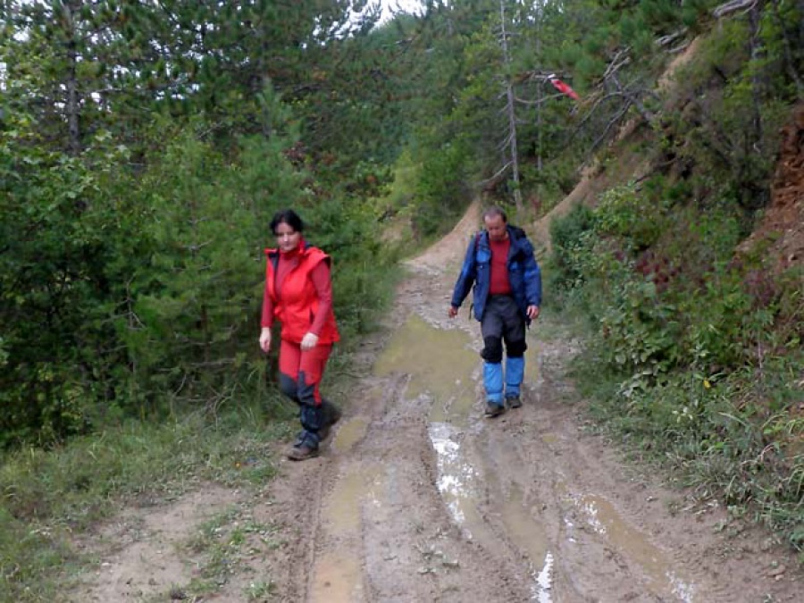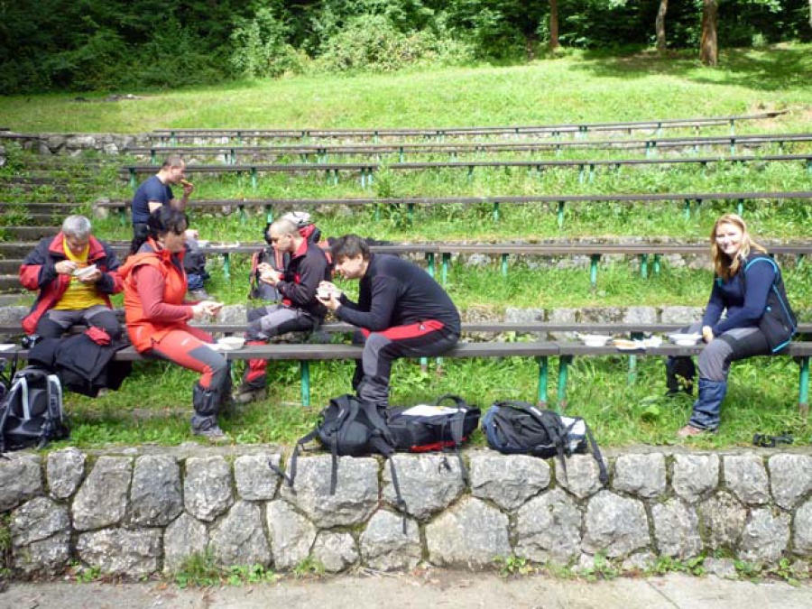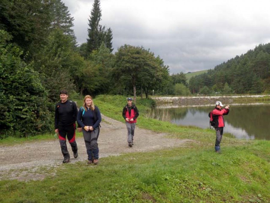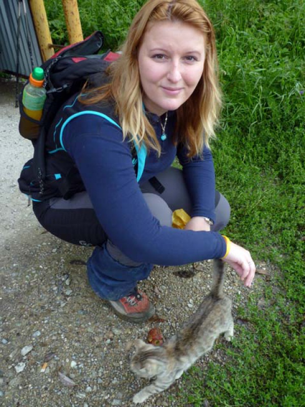 Po niekoľkých krokoch na mňa čakalo nemilé prekvapenie v podobe blata, ktoré sa mi neľútostne prilepilo k topánkam a rozhodlo sa so mnou prejsť celú trasu. Ďakovala som všetkým svätým, že som na štarte neohrdla návlekmi. Po prvú kontrolu, ktorá bola na hlavnej ceste pri Dohňanoch, bolo všetko v poriadku. Tam nás prišlo povzbudil aj malé mačiatko, s ktorým som sa ochotne podelila o svoje skromné zásoby jedla. Po krátkej prestávke sme pokračovali, ale po chvíľke som začala pociťovať prvé otlaky. Dostali sme sa až k Hoštinským rybníkom, kde som si opäť musela urobiť malú pauzu a polepiť poudierané nohy. S novými silami som vyrazila k druhej kontrole, ktorá bola v Hoštinej. Odtiaľ, s upchatým nosom, som ako živá mŕtvola pokračovala s ostatnými ďalej. Lesnými cestami sme sa dostali až po Lachovec na amfiteáter, kde na nás čakal vytúžený cieľ, chutný guláš a pivko na nabratie energie.