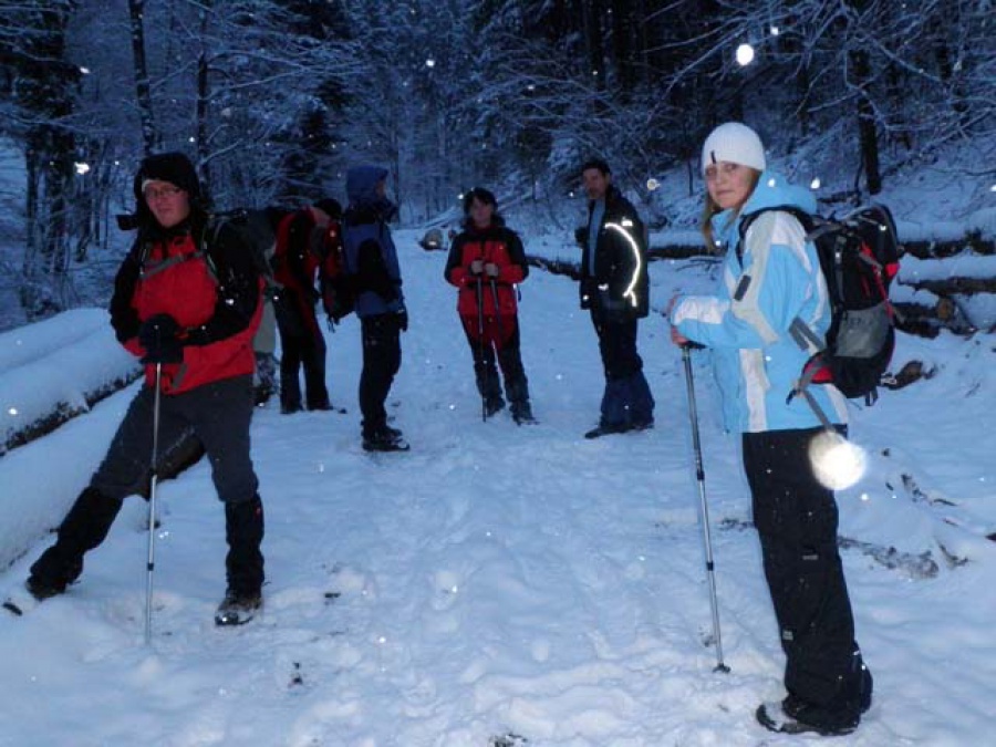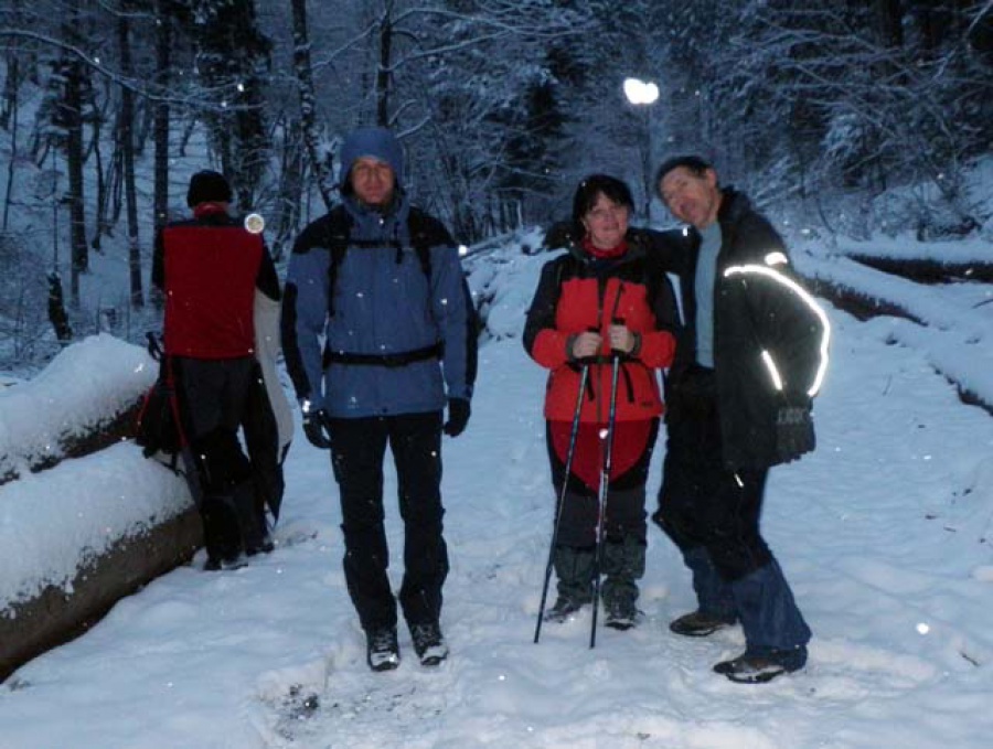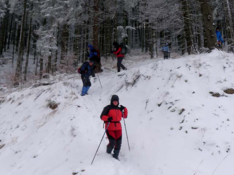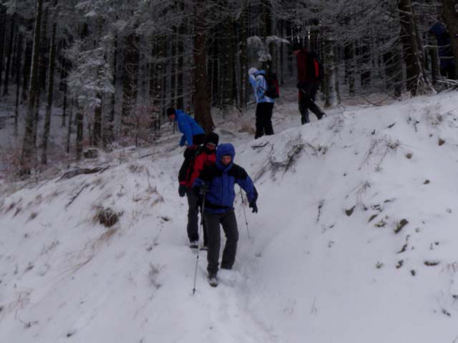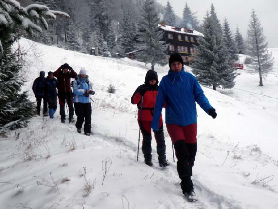 Pre väčšinu z nás bolo najťažšie asi skoré ranné vstávanie na vlak, ktorým sme sa dopravili do Strečna. Odtiaľ sme ešte za tmy vyrazili na pochod. Celou dedinou nás sprevádzal len štekot psov. Na chatu sme sa rozhodli vyjsť Starohradnianskou dolinou. Stúpame pomaly, cesta je zľadovatená alebo zaliata vodou z potoka tečúceho popri chodníku. Tak, ako sme naberali výšku, pribúdala nám pod nohami aj vrstva čerstvo napadaného snehu. O dve hodiny sme prišli na Chatu pod Suchým, kde sme si bez problémov obsadili dva lukratívne stoly hneď oproti kuchyni. To bola odmena za naše skoré vstávanie, pretože na chate, ktorá býva zvyčajne plne obsadená, sedeli zatiaľ len štyria iní turisti. Po necelých dvoch hodinách, po kapustnici a dobre ochutenom čajíčku, opúšťame chatu.