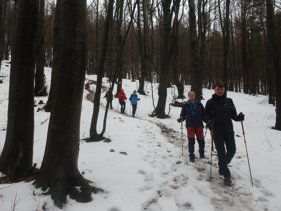 My sme sa rozhodli, že tentokrát pôjdeme zo sedla Homôlka. Autá sme zaparkovali pod lyžiarskym vlekom pri bufete Partizán. Po týždeň trvajúcich mrazoch (okolo -10°C), nastalo rapídne oteplenie (až tak, že sme videli nezvyčajne na toto ročné obdobie Salamandru škvrnitú), ale aj tak z rána bol terén zľadovatelý a bez turistických mačiek by bol výstup nebezpečný. Po modrej turistickej značke sme sa krátkym ale pomerne prudkým stúpaním dostali na bočný hrebeň, ktorý nás doviedol k smerovníku Srvátkova lúka, kde sme sa napojili na červeno značenú Cestu hrdinov SNP. Kúsok za smerovníkom bolo vybudované oddychové miesto s ohniskom a dvomi prístreškami proti dažďu. Po krátkej prestávke sme pokračovali zvlneným terénom a záverečným strmým stúpaním až do sedla Palúch a odtiaľ úzkym chodníkom k malej jaskyni, kde v prípade zlého počasia by sa dalo skryť. Pri jaskyni sa cesta rozdelila, vľavo sa išlo priamo na vrchol, túto variantu sme si zvolili aj my a vpravo sa išlo na malú lúku, kde sa nachádzalo ohnisko. Na skalnatom vrchole sa nachádzal kríž, od ktorého boli 360° výhľady do okolia. Aj keď bolo relatívne teplo, prudký vietor nás prinútil zaveliť na ústup. Keďže sme boli autami a nechcelo sa nám vymýšľať rôzne varianty, tak sme sa rovnakou trasou vrátili naspäť na parkovisko k autám.