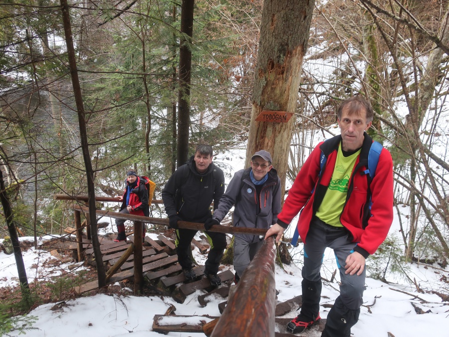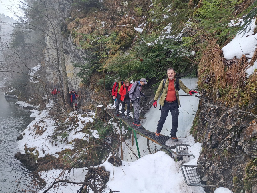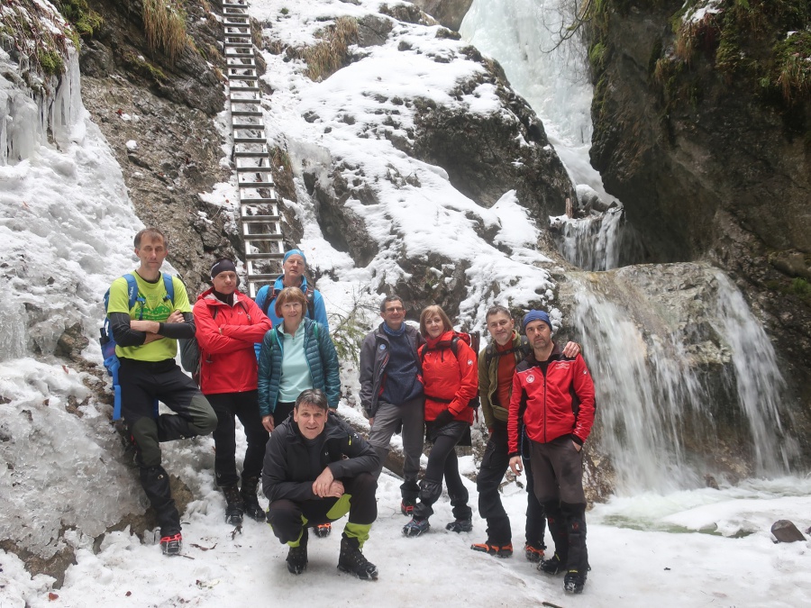 V sobotu sme sa rozhodli prejsť asi najmenej navštevovanú roklinu Veľký Sokol. Dôvodom je jej zlá dostupnosť (hlavne v zime) a mnohých odrádza aj jej dĺžka. V zimných mesiacoch bol prechod touto roklinou ozajstným turistickým zážitkom. Jednosmerný prechod bol zabezpečený sústavou drevených či kovových rebríkov, mostíkov a stúpačiek. Postupným prechádzaním rokliny sme mohli na bočných skalných stenách obdivovať nádherné cencúle, ľadové závesy a ľadopády. Po opustení rokliny sme sa napojili na Glackú cestu, ktorá nás doviedla k smerovníku Malá poľana a stále po červenej turistickej značke smerom k rázcestiu Palc a odtiaľ po žltej do osady Píla, kde sme mali zaparkovanú dodávku.
